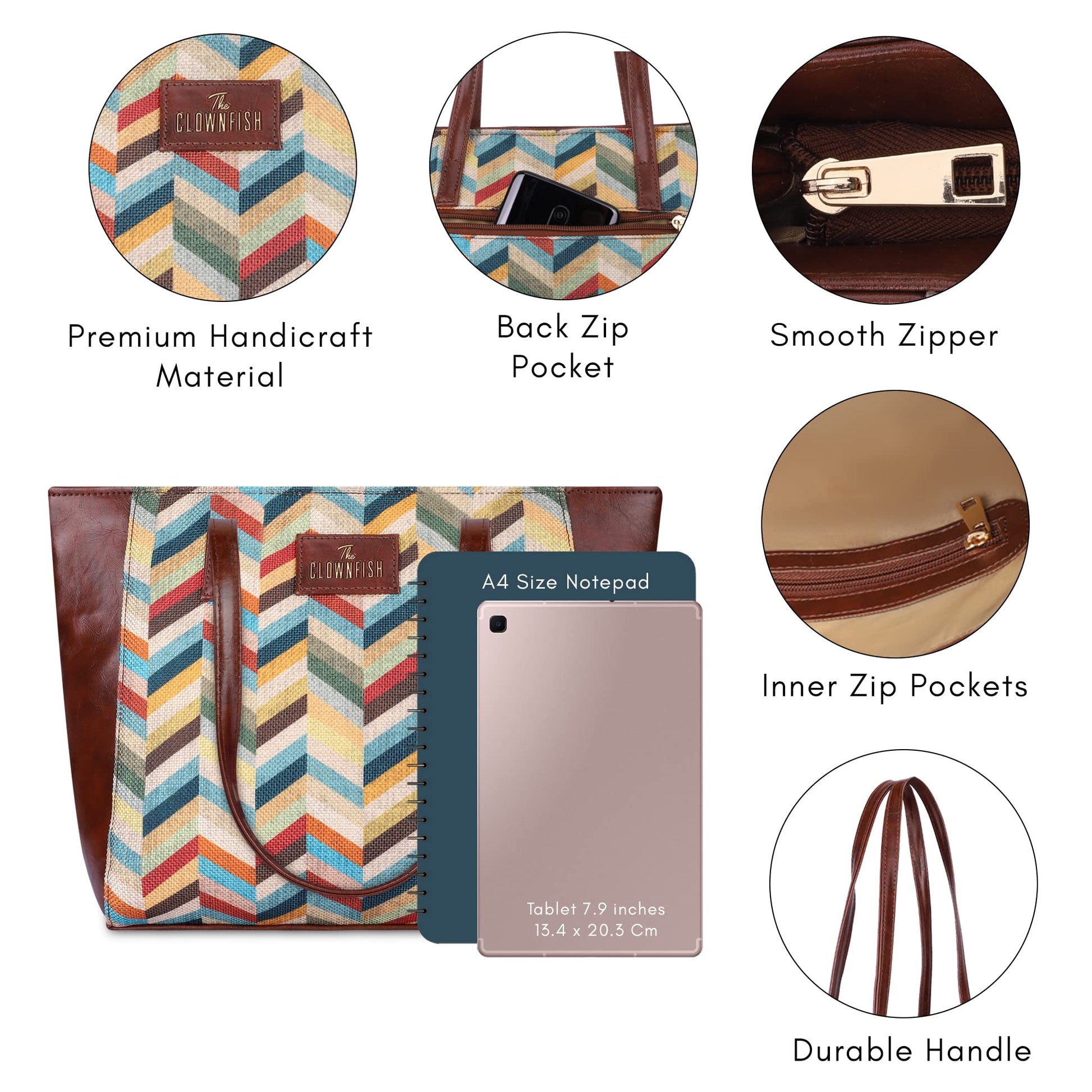 THE CLOWNFISH Valentine Printed Handicraft Fabric & Faux Leather Handbag for Women Office Bag Ladies Shoulder Bag Tote for Women College Girls (Multicolour-Wave Design)