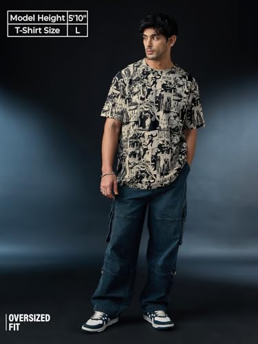 The Souled Store Batman: Gotham City Men and Boys Half Sleeves Round Neck Graphic Printed Cotton Lightweight All-Season Oversized T-Shirt Beige