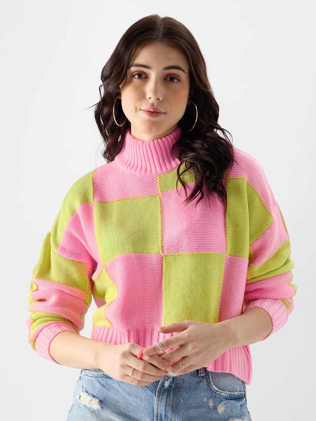 The Souled Store Colorblock: Candy Lime Women Turtle Neck Sweaters Cozy Warm Soft Winter Sweater Fashion Trendy Comfortable Crew Neck Unisex Style Chunky Sweaters wear Pullover Cardigan