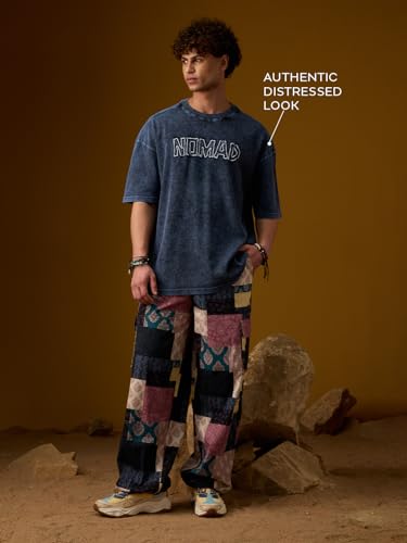 The Souled Store Nomad: Haven Men and Boys Short Sleeves Round Neck Charcoal Grey Embroidered Casual Drop Shoulder Streetwear Trendy Super Oversized T-Shirt
