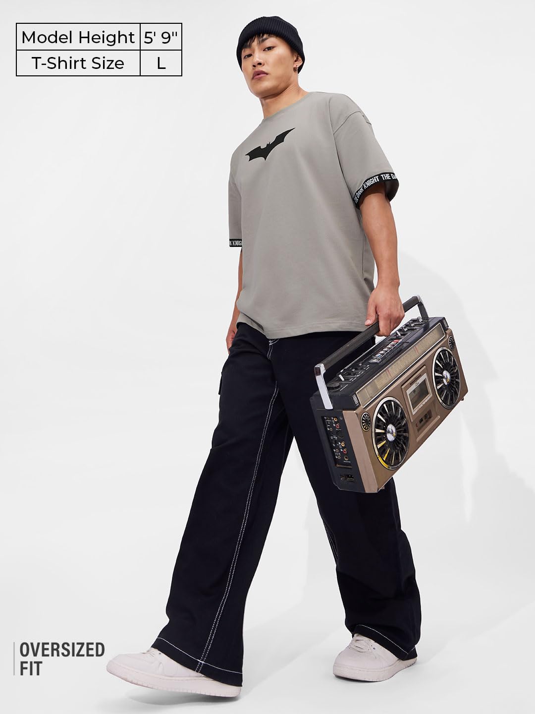 The Souled Store Official Batman: Logo Men and Boys Short Sleeves Round Neck Grey Graphic Printed Cotton Oversized T-Shirts