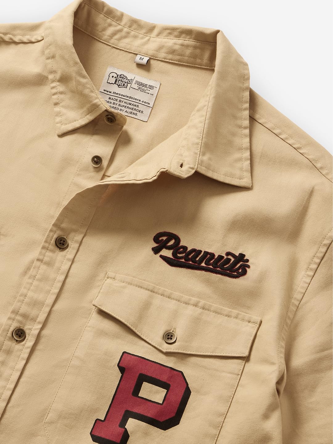 The Souled Store Official Peanuts: Big 50 Men and Boys Long Sleeve Collared Neck Button Down Brown Graphic Printed Regular Fit Cotton Utility Shirts