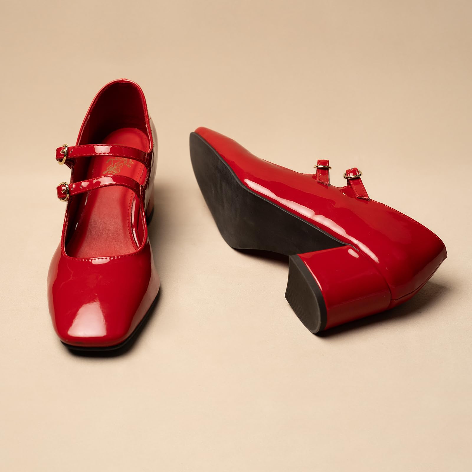 Theater Women Red Mary Jane Block Heels | Double Strap Square Toe Pumps | Stylish & Comfortable Sandals for Office, Party & Causal wear