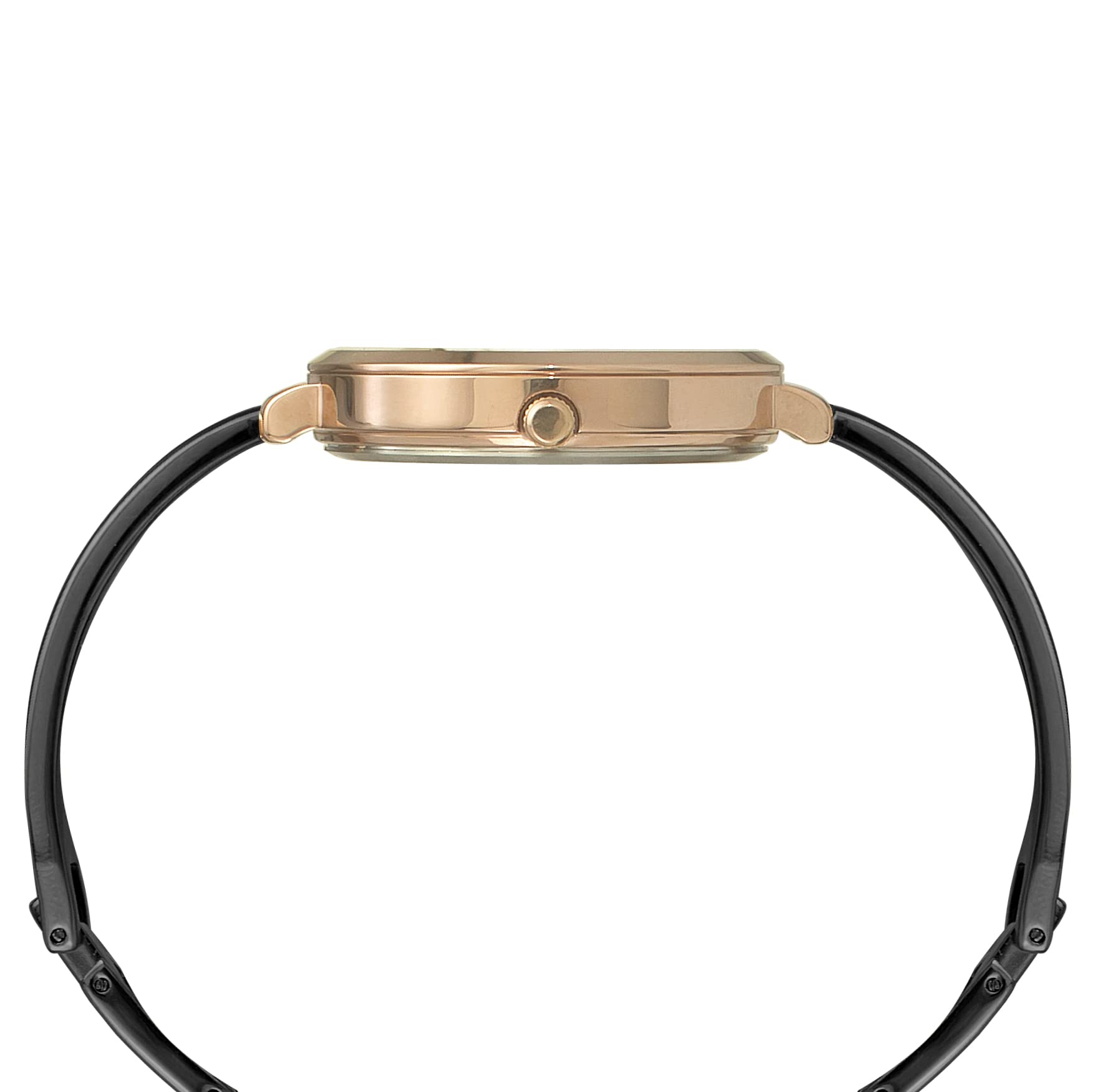 Details: 34 mm women’s fashion case with fashionable black half bangle bracelet and black dial