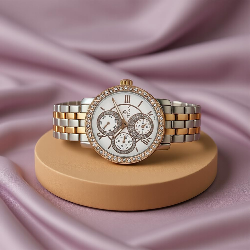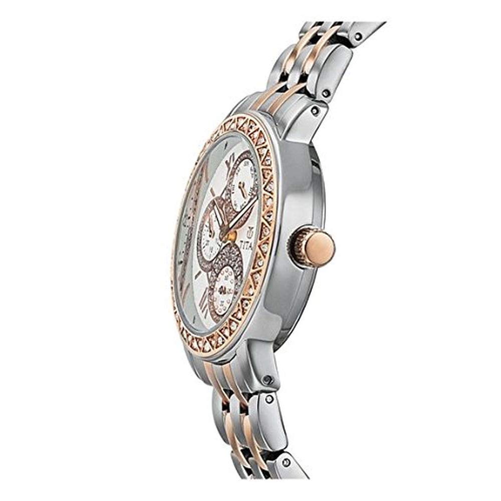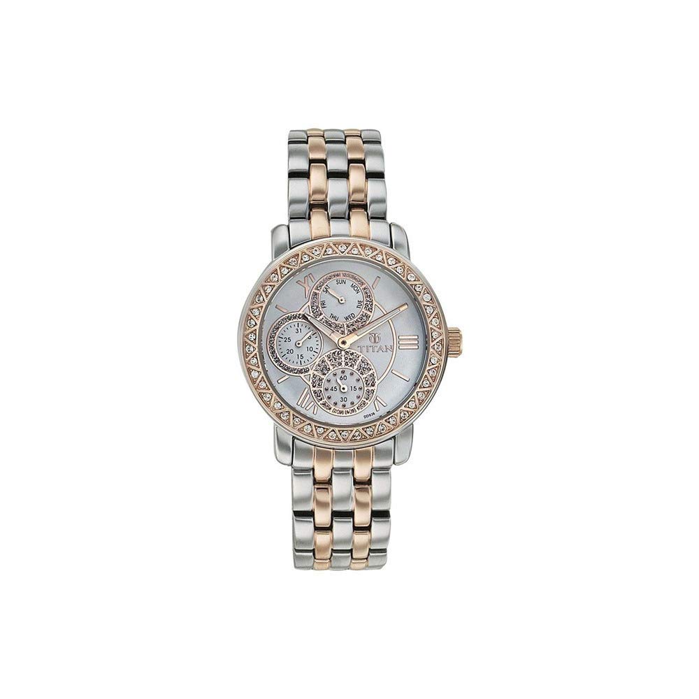 Details: This analog watch for women has a round, silver-white dial, featuring two plain hands and three subdials. A crown on the studded case lets you adjust the time. Its rose gold and silver brass strap is fastened by a jewellery clasp.