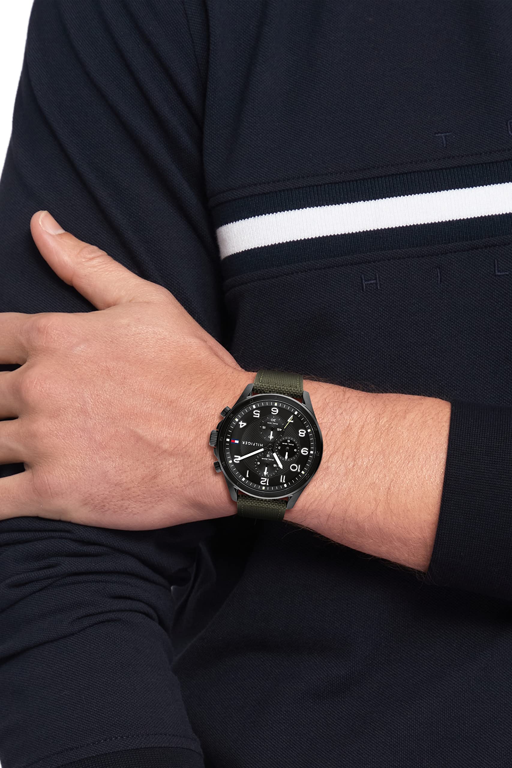Stay on top of your Style game with this Tommy Hilfiger watch. 45mm BLACK Dial ROUND Shaped GREEN SILICONE SILICONE Watch with 50 meters water resistance. Tommy Hilfiger watches epitomise this classic cool American style with a twist.