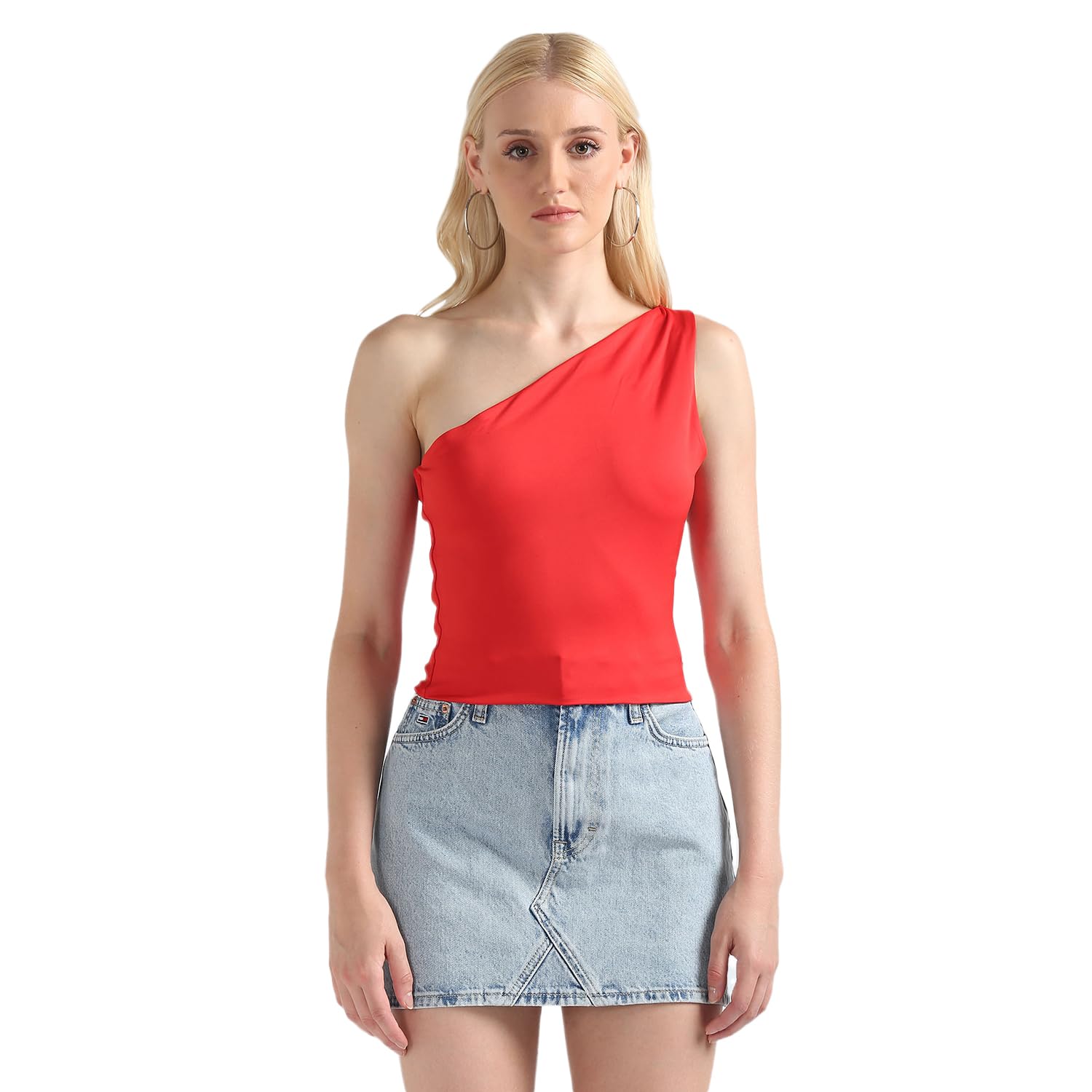 Tommy Hilfiger Polyester Red Solid One Shoulder One Shoulder Women Asymetric Top (L)