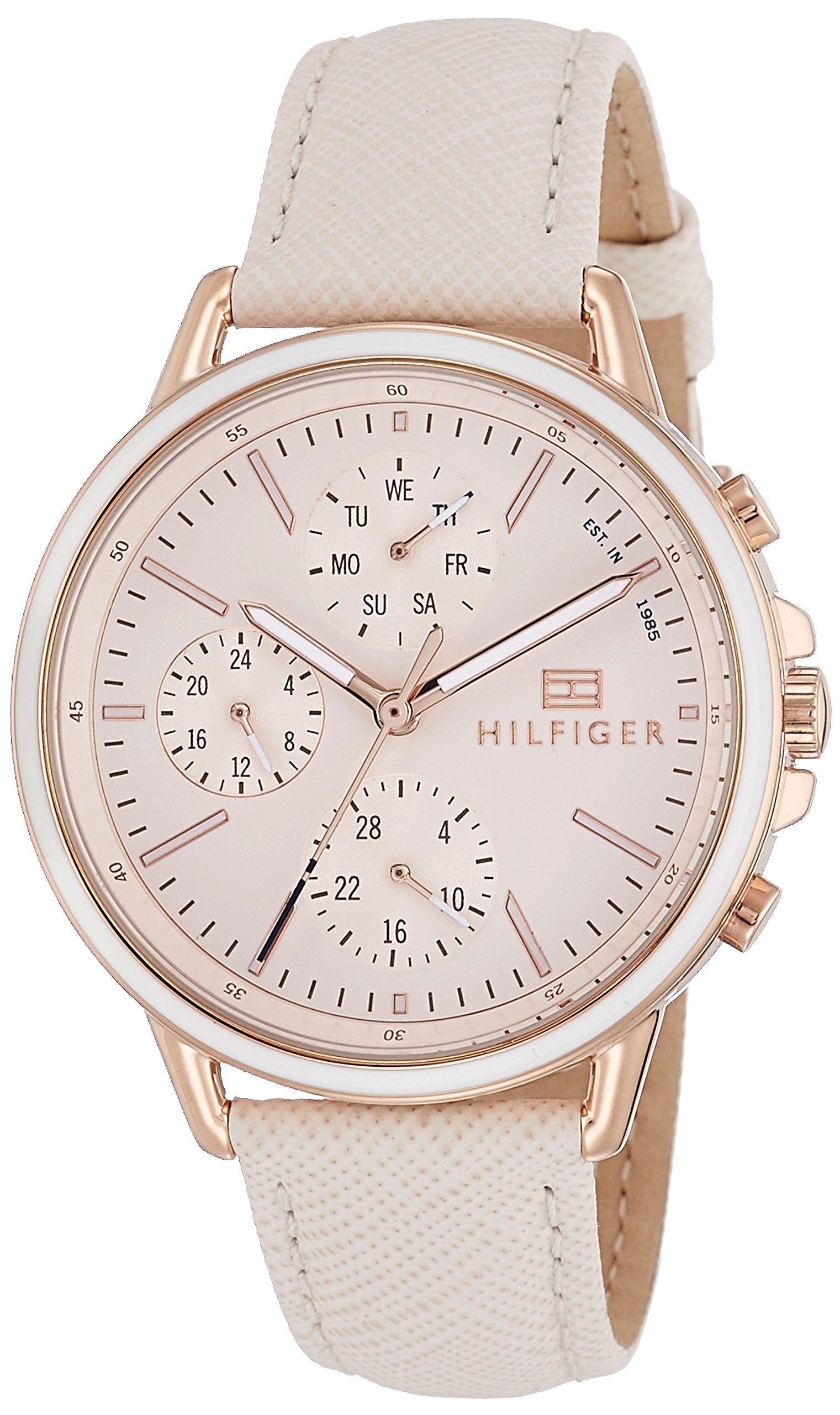 Tommy Hilfiger Quartz Analog with Day and Date Pink Dial Leather Strap Watch for Women-NETH1781789