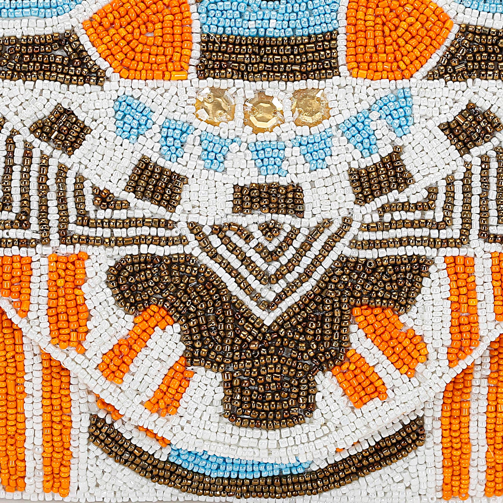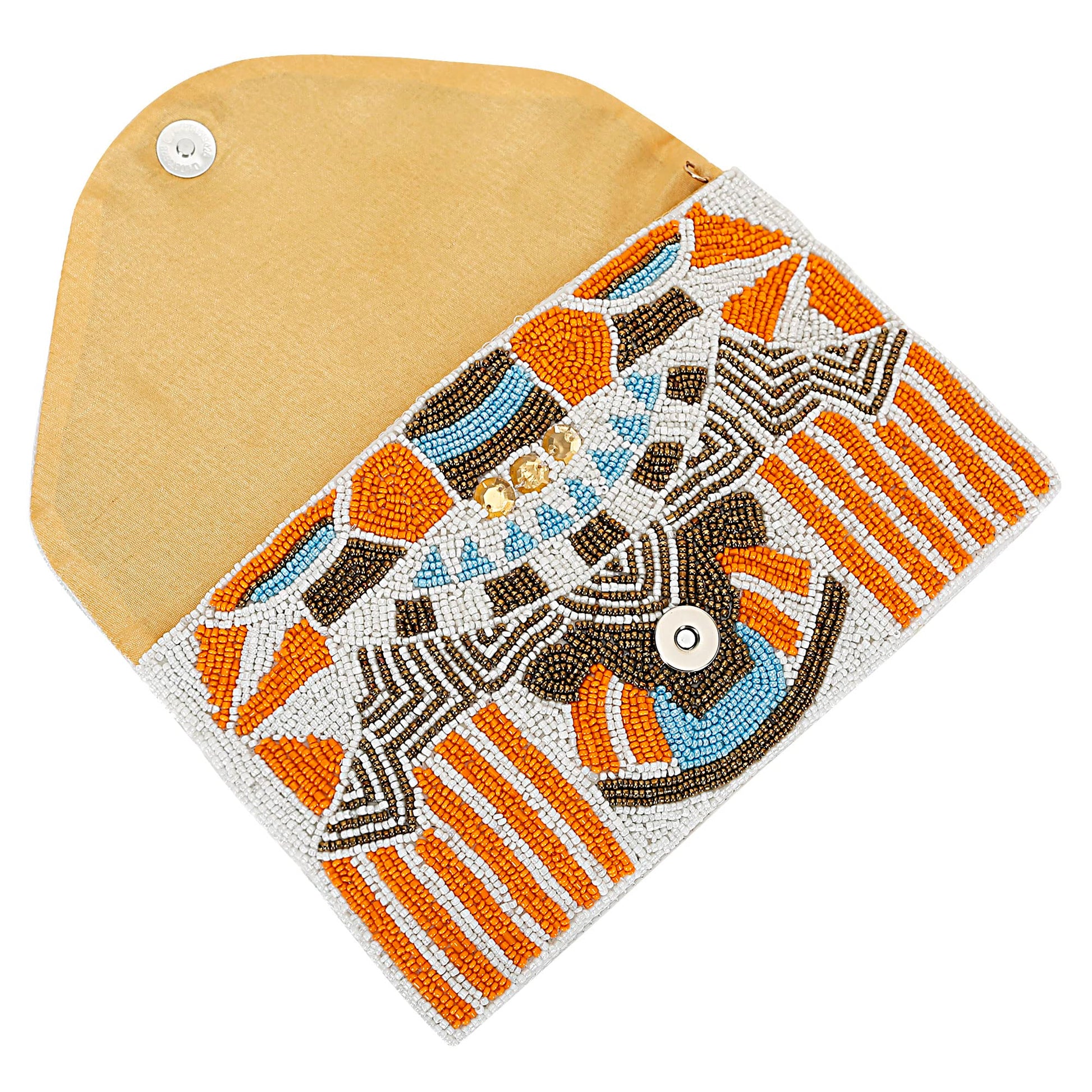 - This attractive and trending Boho clutch is made with beaded handwork and beautiful floral motifs in a multicolored hues. High end cotton material and adorned with beautiful floral embellishments.