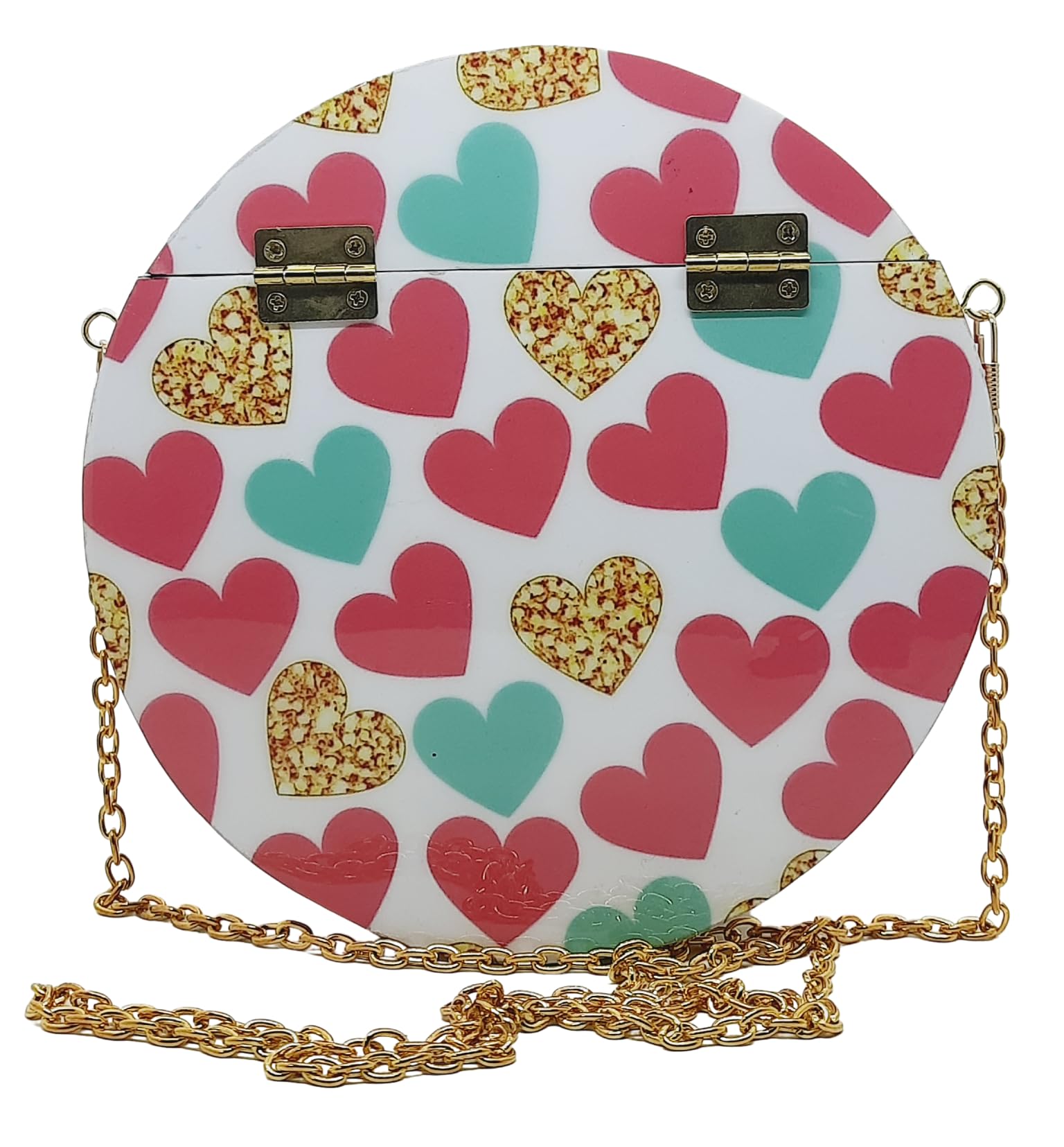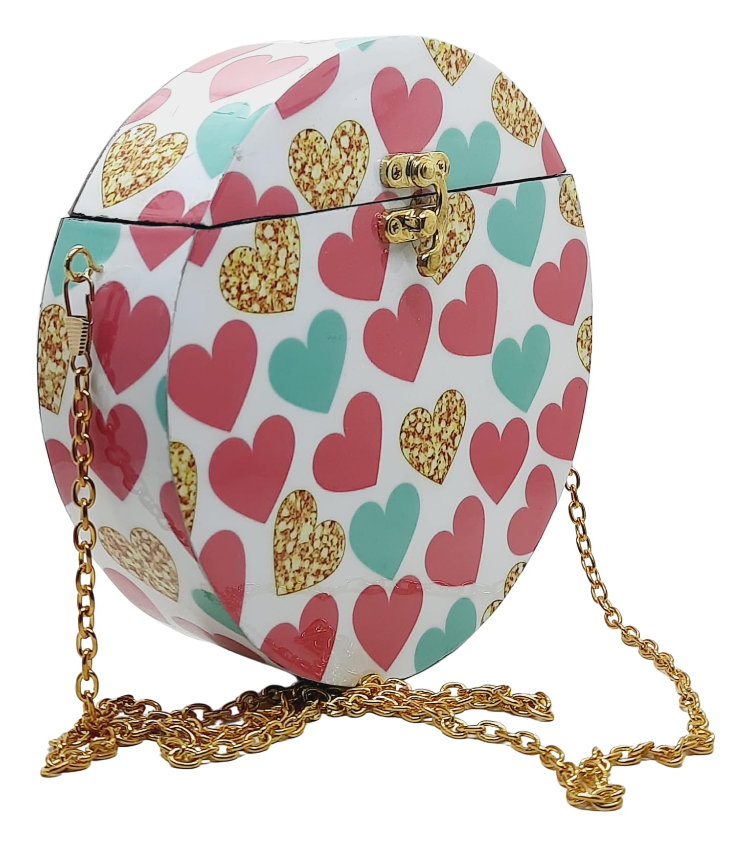 Trend Overseas Women's Handmade Wooden Printed Round Ethnic Clutch Bag/Bridal Purse/Handbag_Crossbody Sling Bags for Party (7.5 Inch) (Pink Heart)