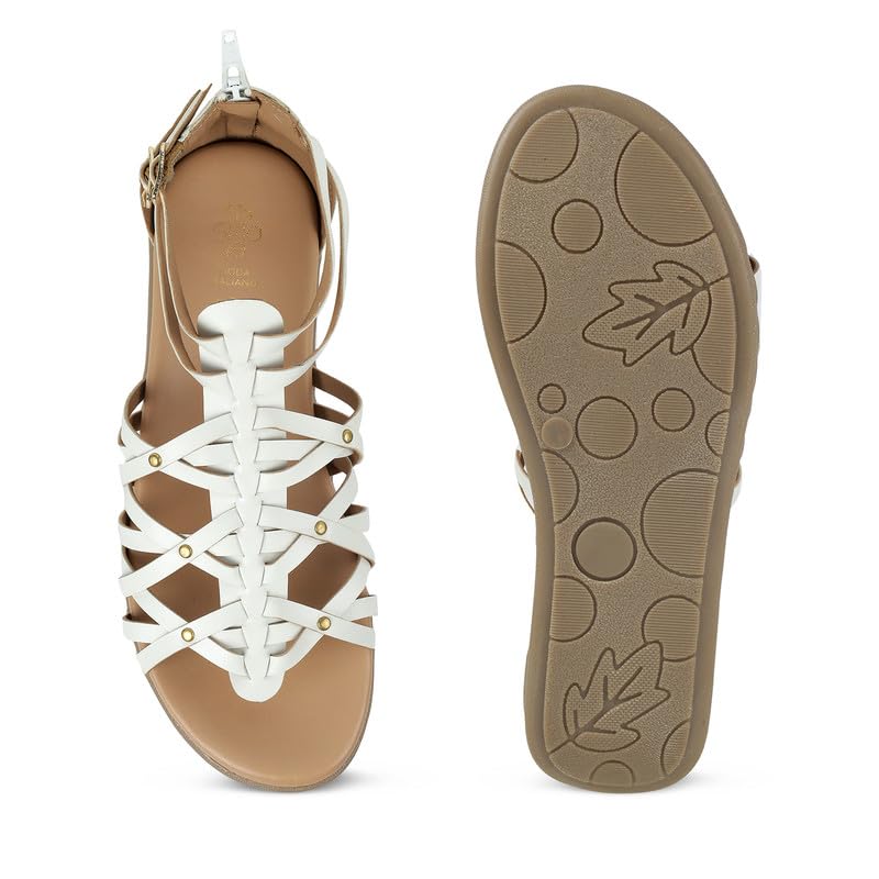 - Stylish Design: Intricate strappy gladiator-inspired sandals in rich white with subtle gold-toned stud accents and woven detailing for a modern, chic look.