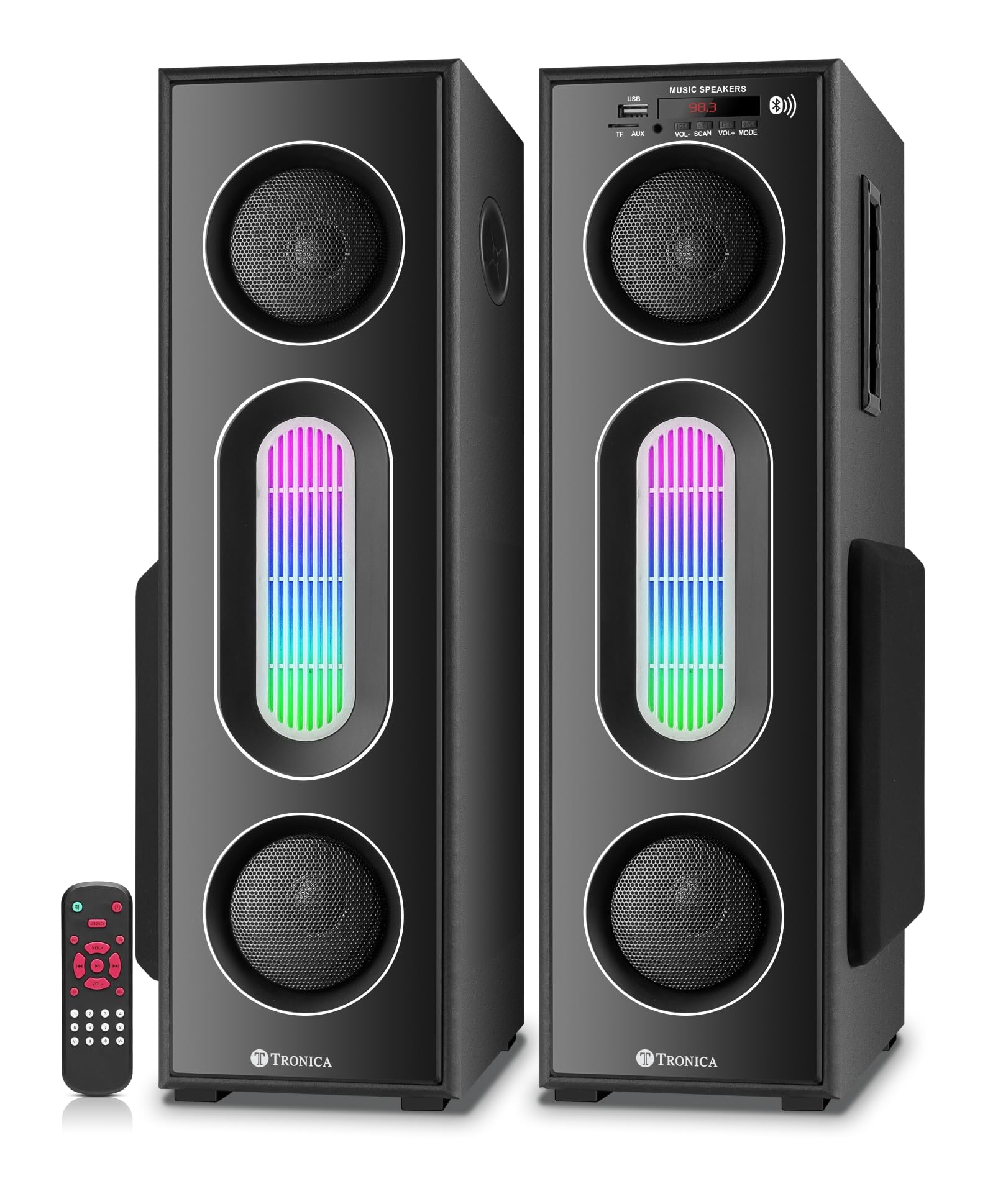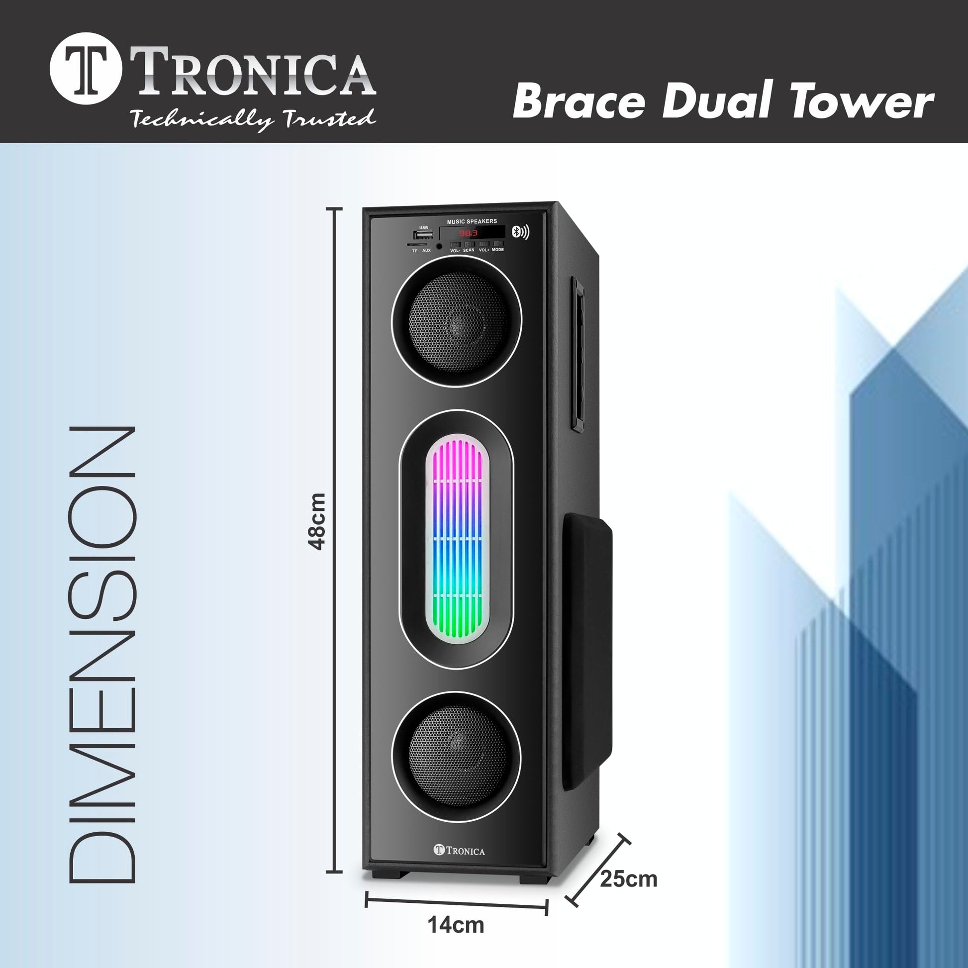 Details: Tronica Brace Dual Tower Bluetooth Home Theater System by TRONICA with FM/Pendrive/Aux/TV support & Remote with Wireless Mic.You can enjoy grooving to your favorite tunes with the Brace Dual Tower Bluetooth Speaker. With an output of up to 70 W, it produces high-quality sound. Its rich and deep bass helps you enjoy every thumping beat with optimal audio quality. Moreover, this speaker comes with a smart remote control that allows you to control the audio.It has Disco RGB light effects. .