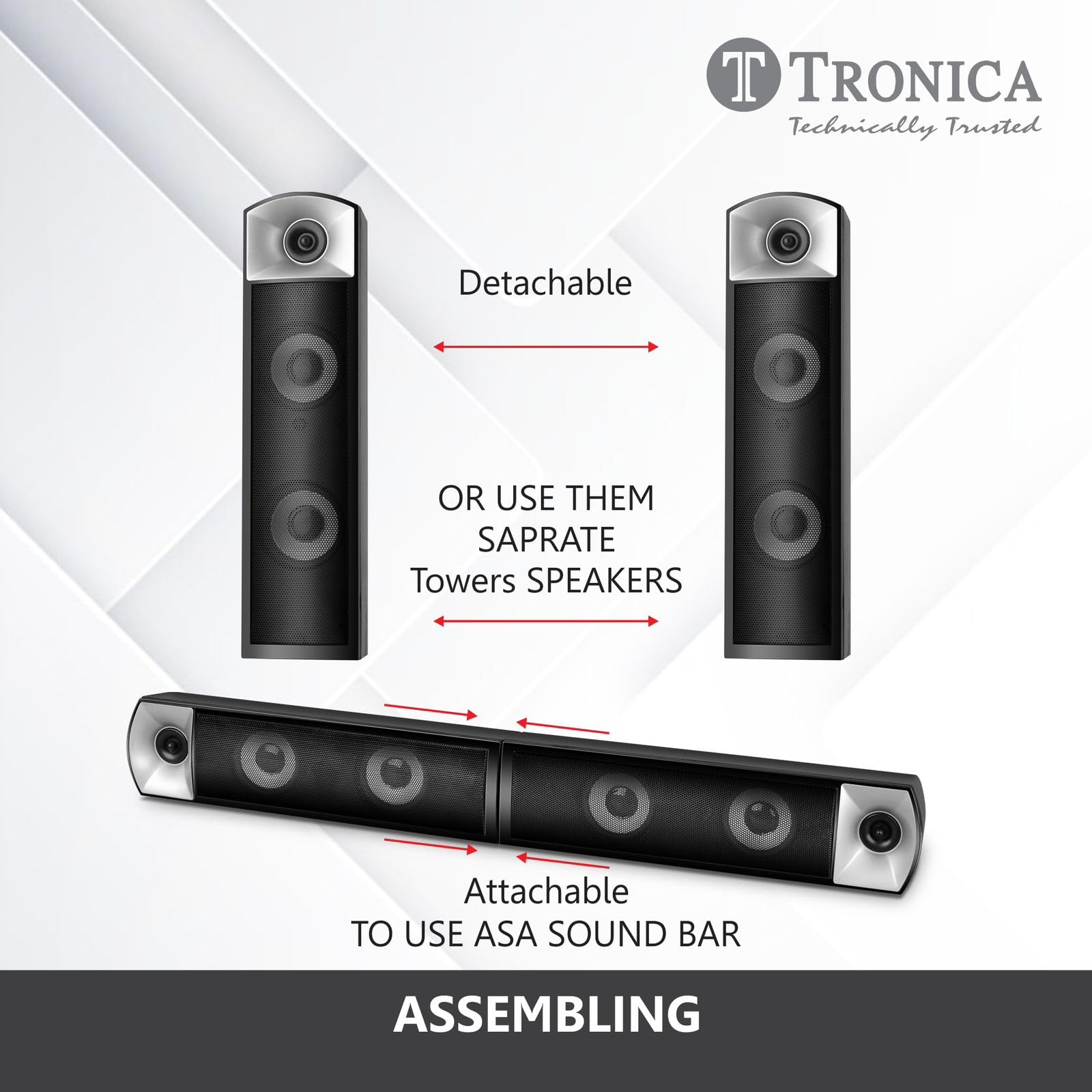 - Two separate 5.25 inches woofer housed in two solid 8mm MDFcabinets, with four 3 inches speakers housed in ABS plastic bar delivering 85W output with punchy bass