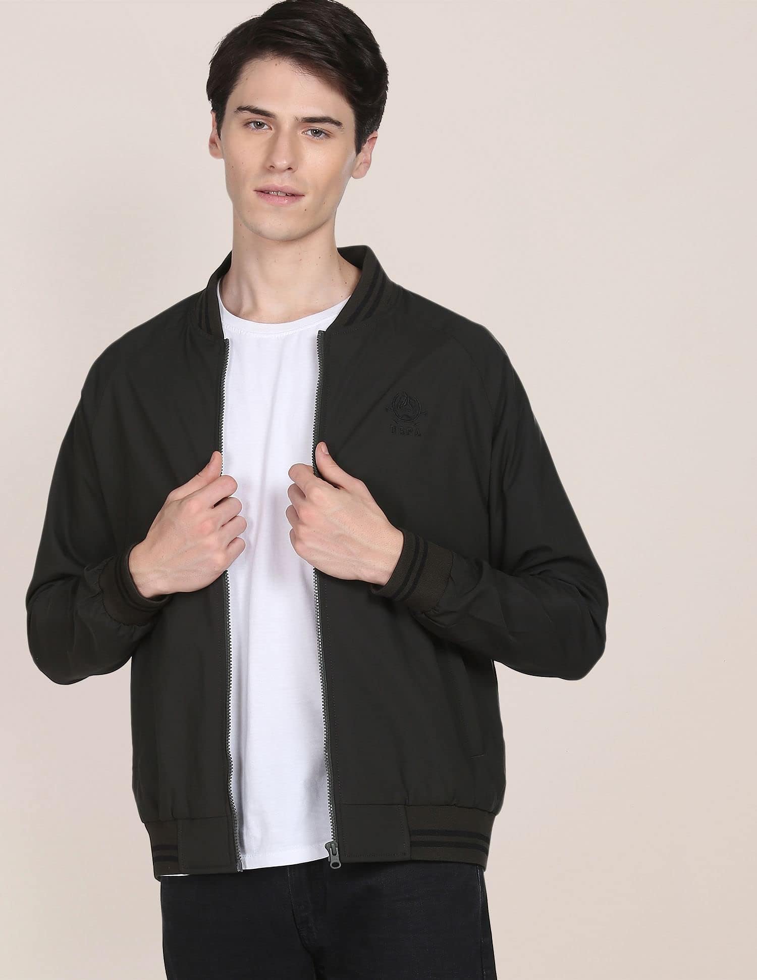 U.S. Polo Assn. Men Dark Green Striped Hem Solid Bomber Jacket