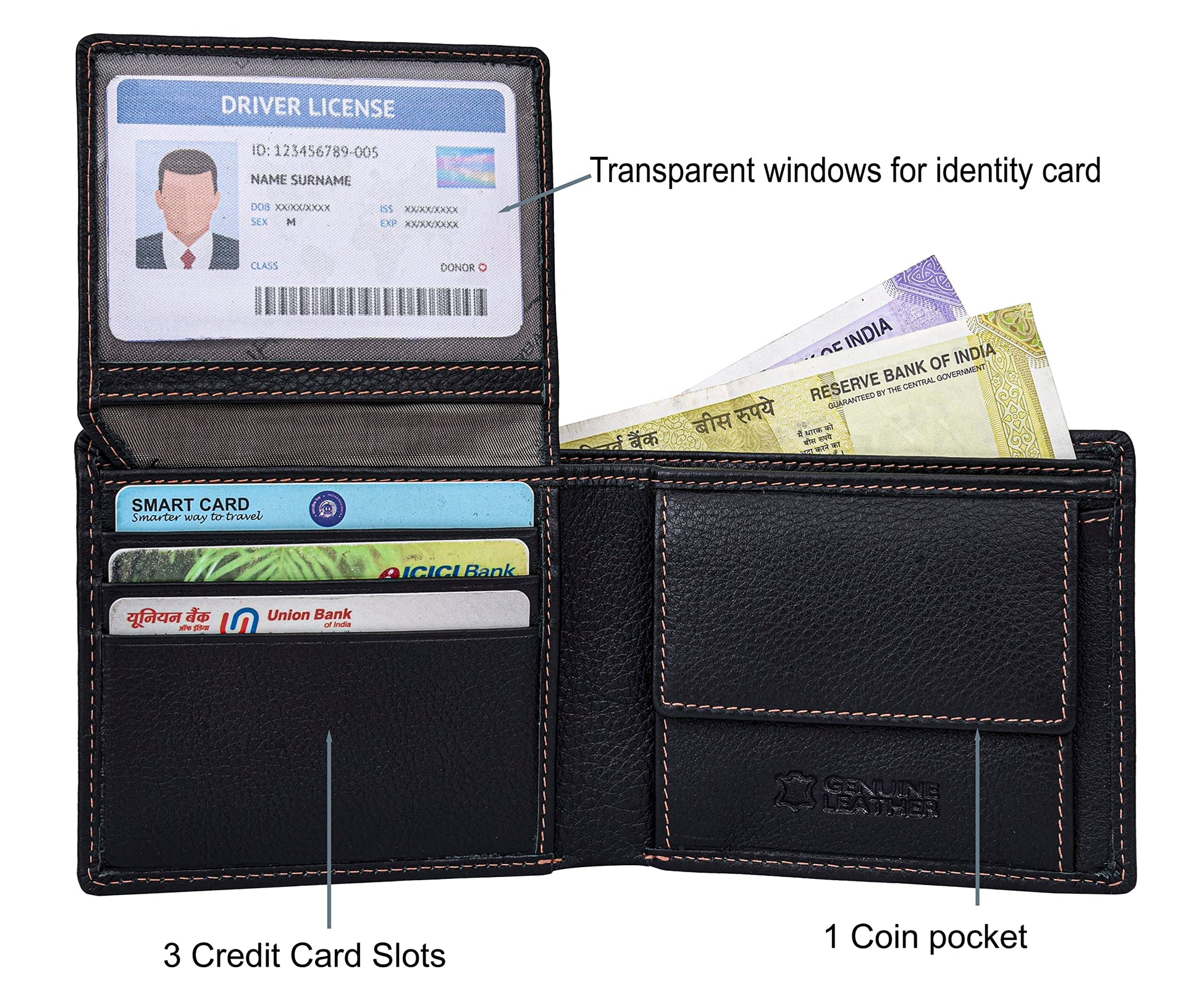 - COMPACT, SLEEK AND SPACIOUS MEN’S WALLET LEATHER - Unique Design and Compact Size, this Wallet is not at all Bulky. The size is just Perfect to fit in your Pocket with Ease or to be kept in your Travel bag. It is a Perfect Combination of Size and Space with Numerous Compartments for all your Cards, Bills, Receipts and also a Photo of your Loved One.