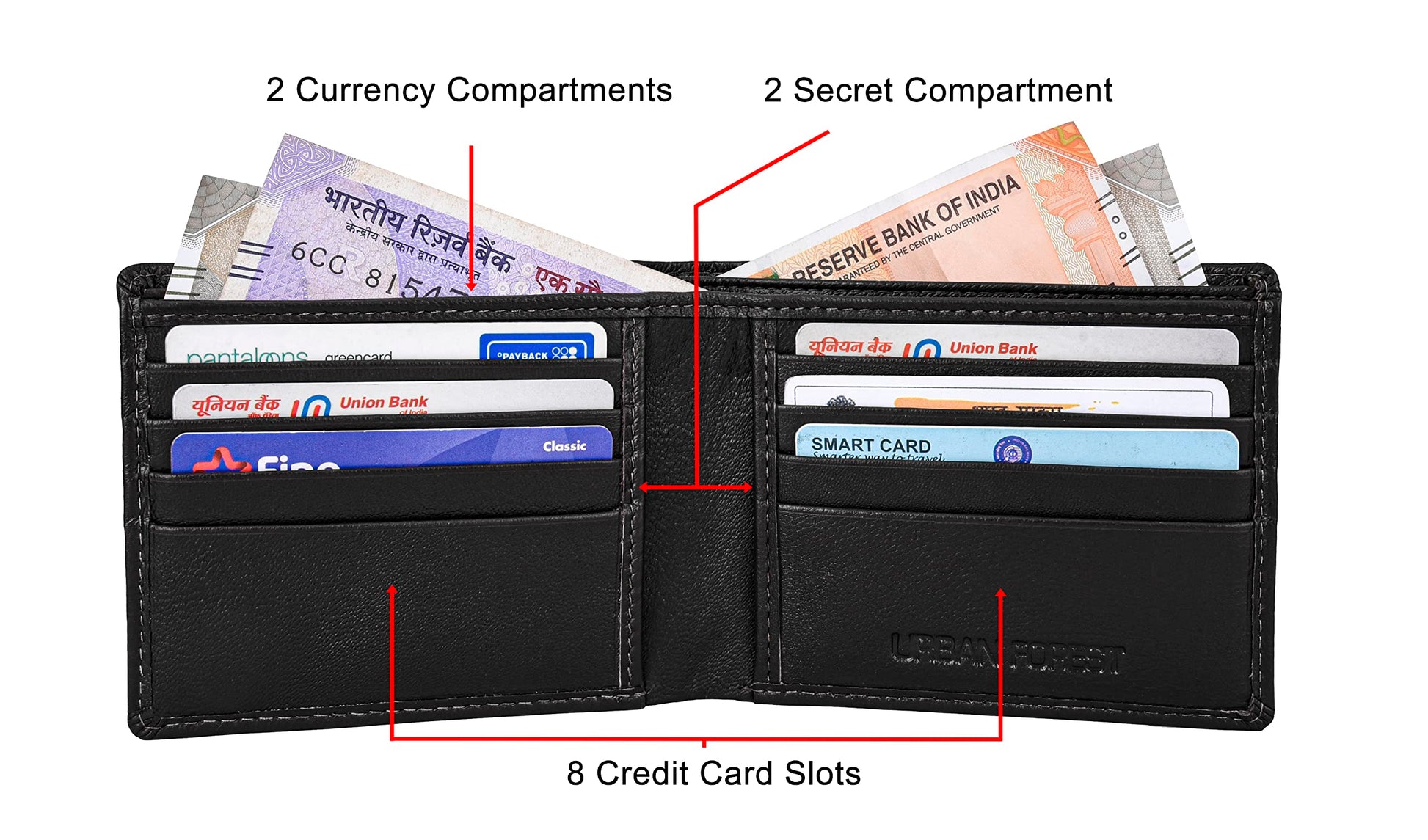 - COMPARTMENTS - The wallet has 8 in-build card slots, 2 currency slots & 2 secret compartment.