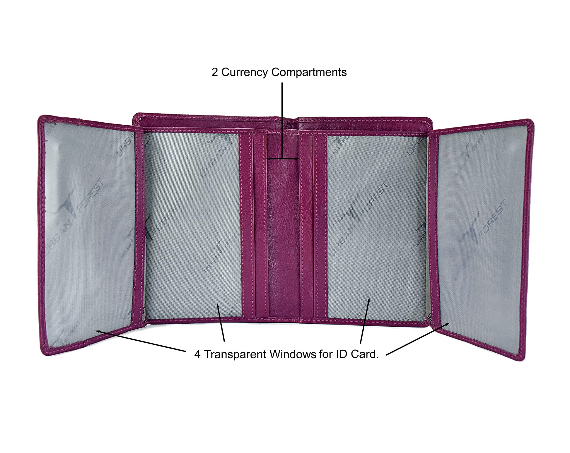 - INGENIOUS DESIGN - Keep all your Essentials Neat and Organised in this Stylish Wallet which Features 2 Separate openings. The Front Flap with a Button Closure opens into a tri-fold area which has 12 Card Slots , 5 Clear Pockets for your Driver's License and other bills, 2 Currency Slots and a large Zippered Pocket with 2 Compartments for all your Coins.