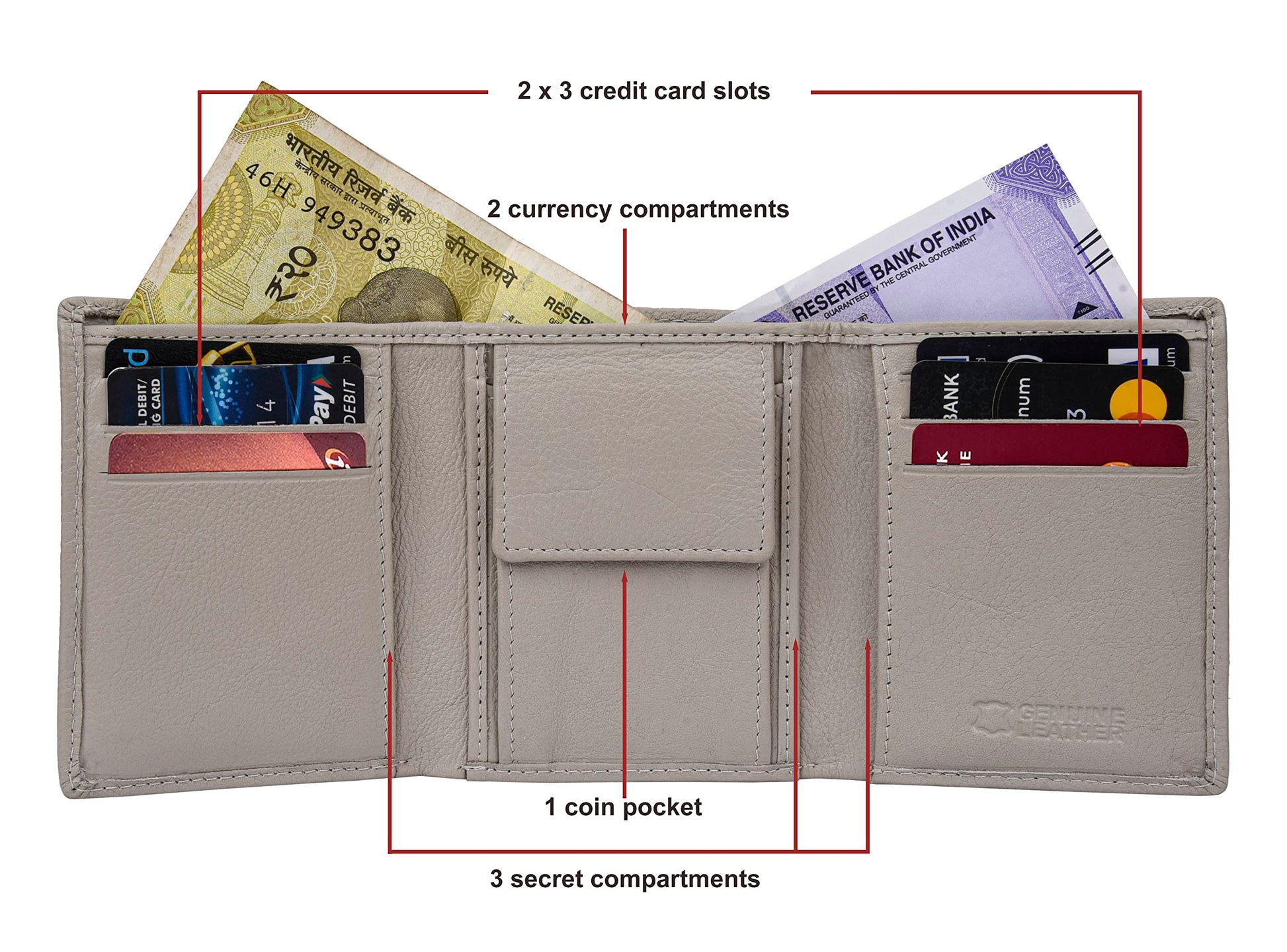 - GENIOUS DESIGN - Keep all your essentials neat and organised in this exclusive vertical wallet. It's typically a bi-fold wallet with a button closure inside which opens to reveal an extra flap. It has 2 x 3 card slots , 2 currency slots , 1 Coin pocket and 3 secret compartments .