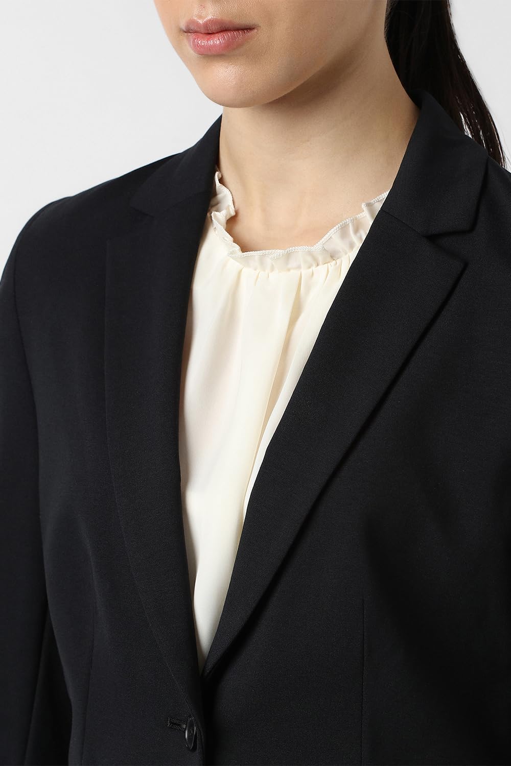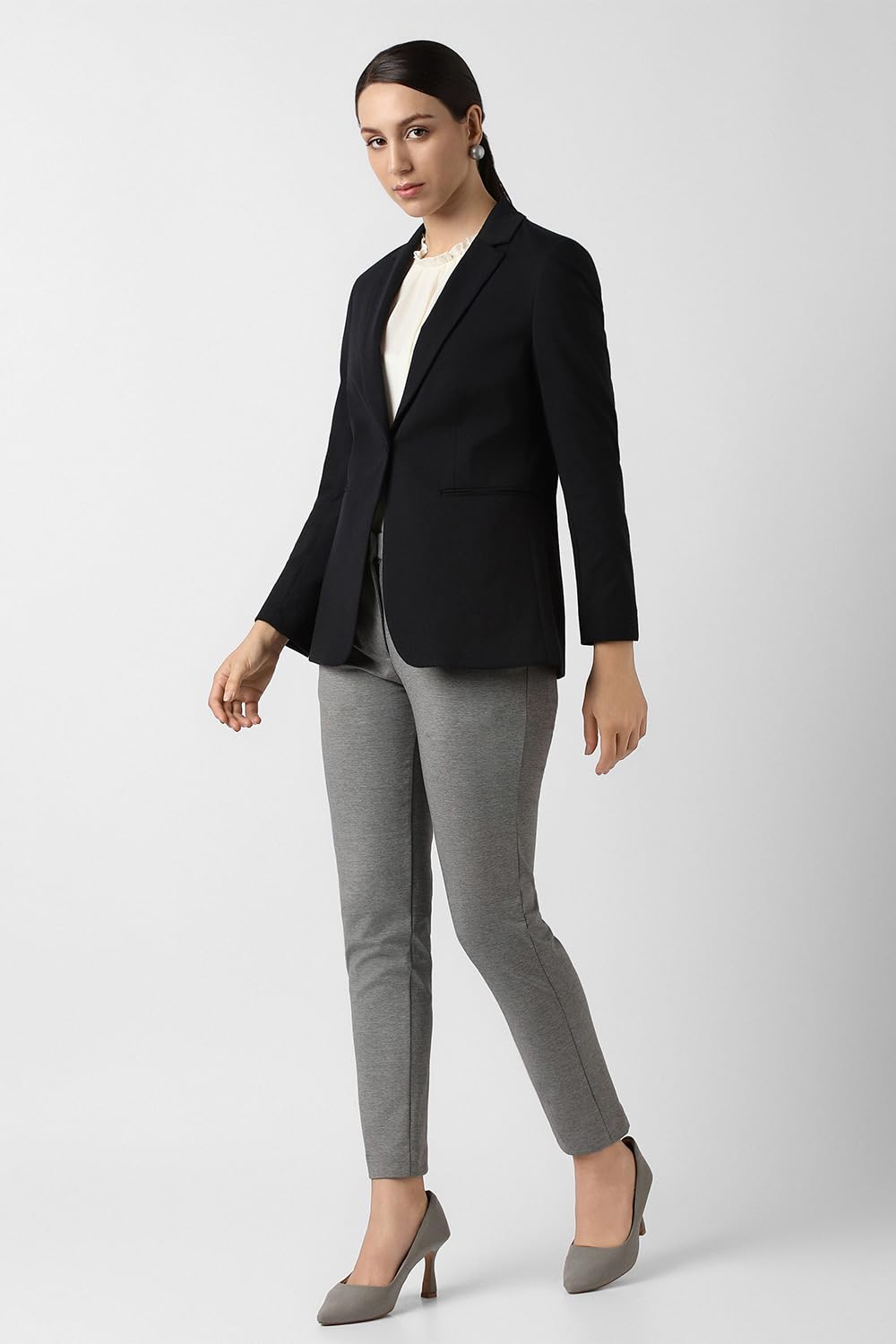 Elevate your formal wardrobe with the Van Heusen black blazer, expertly crafted from a blend of cotton, nylon, and spandex. This solid blazer features a sophisticated single-button closure, ensuring a tailored look that exudes elegance and confidence. Perfect for formal occasions, its contemporary design harmonizes comfort with style, making it an essential piece for any discerning woman. Experience refined sophistication with this luxurious addition to your collection.