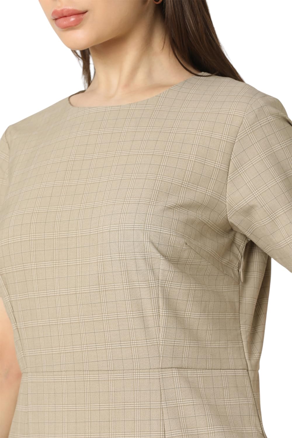 Introducing the Van Heusen women's dress in a sophisticated beige check pattern. Crafted from a luxurious blend of polyester and viscose, this regular-fit dress features a flattering round neckline and short sleeves, making it a versatile choice for formal occasions. The refined design effortlessly combines comfort with elegance, ensuring you make a lasting impression. Elevate your wardrobe with this timeless piece that embodies style and sophistication.
