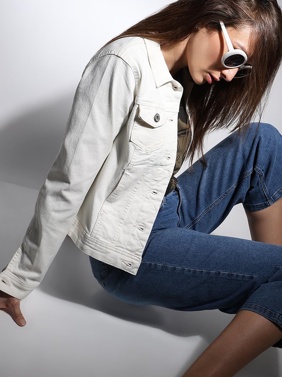 This wardrobe essential comes in a timeless off-white hue, featuring long sleeves with cuffs for a classic touch. The collar neckline and front button placket add a sophisticated flair, while the regular fit ensures comfort and versatility. With a length that falls gracefully above the hips, this jacket effortlessly complements your silhouette. Designed to be both stylish and practical, our denim jacket is a summer wardrobe must-have. Style Note: Pair it with your favourite sundress or a casual tee and shorts for a laid-back yet polished summer ensemble