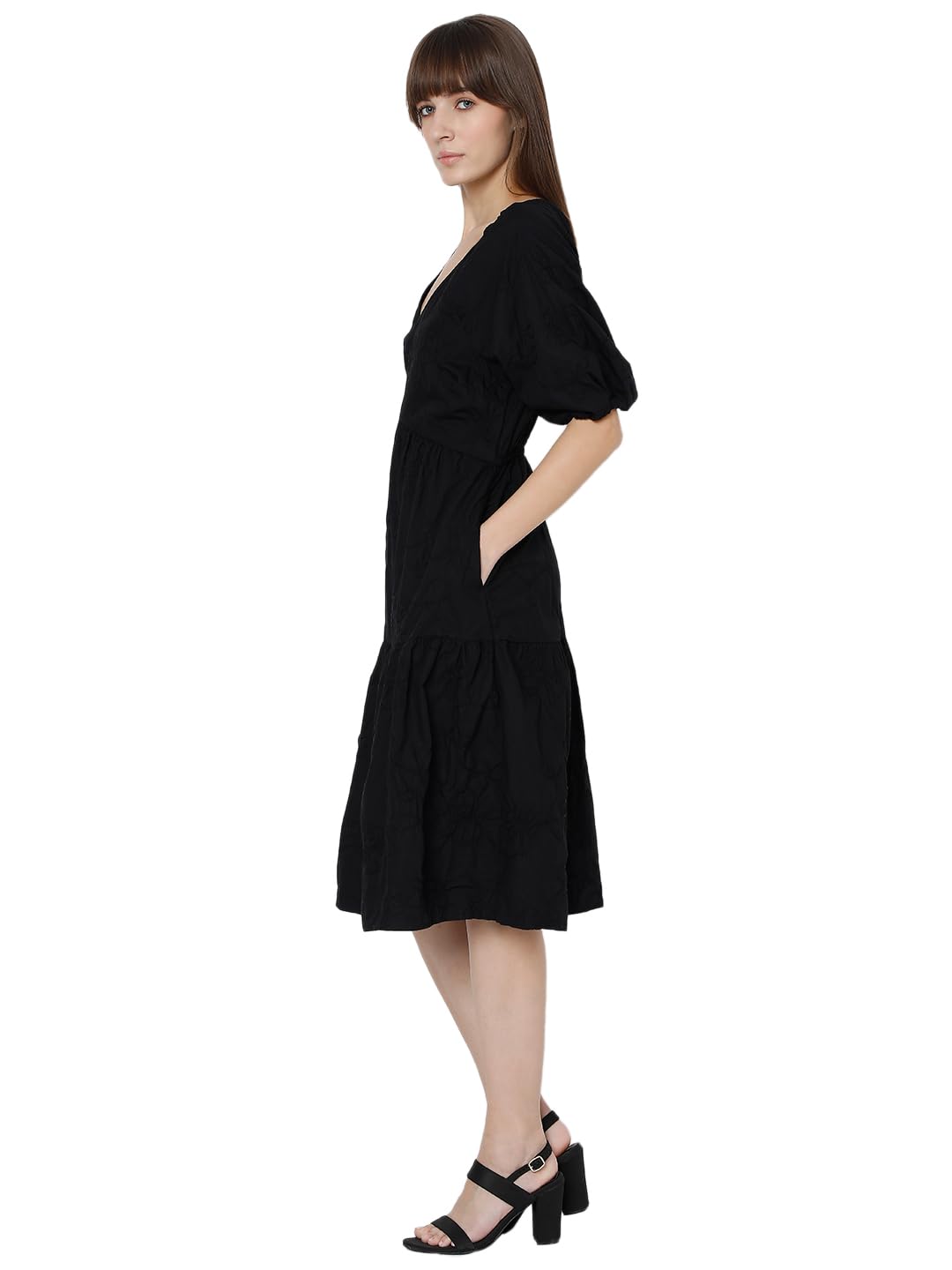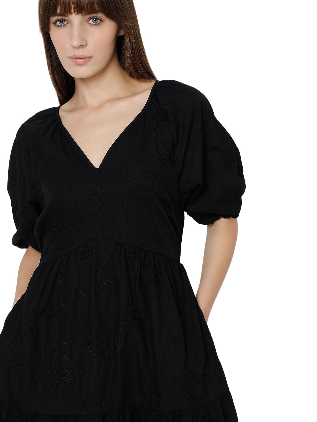 Elevate your everyday style with this elegant black fit & flare dress. Designed with intricate thread embroidery all over, it features a flattering V-neckline and short, voluminous sleeves with elastic for a playful touch. Falling gracefully at the knee, this piece combines timeless sophistication with effortless charm, making it perfect for any occasion.