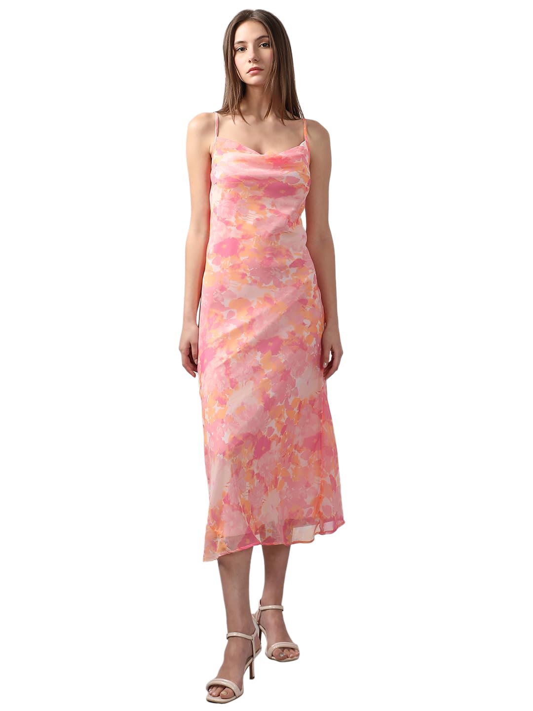 This elegant pink strap dress features an all-over print and a flattering cowl neckline. Perfect for effortless chic, it combines comfort with a touch of timeless style.
