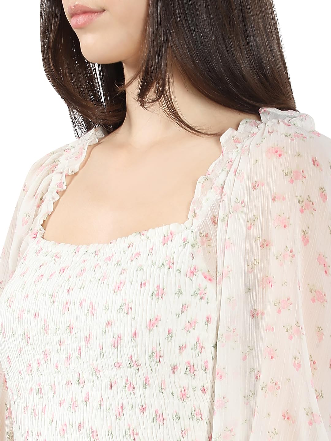 This white floral-printed midi dress features a flattering fit & flare silhouette with bishop sleeves and a square neckline. The curved hemline and side slit add a touch of elegance, making it the perfect choice for effortless chic this summer!