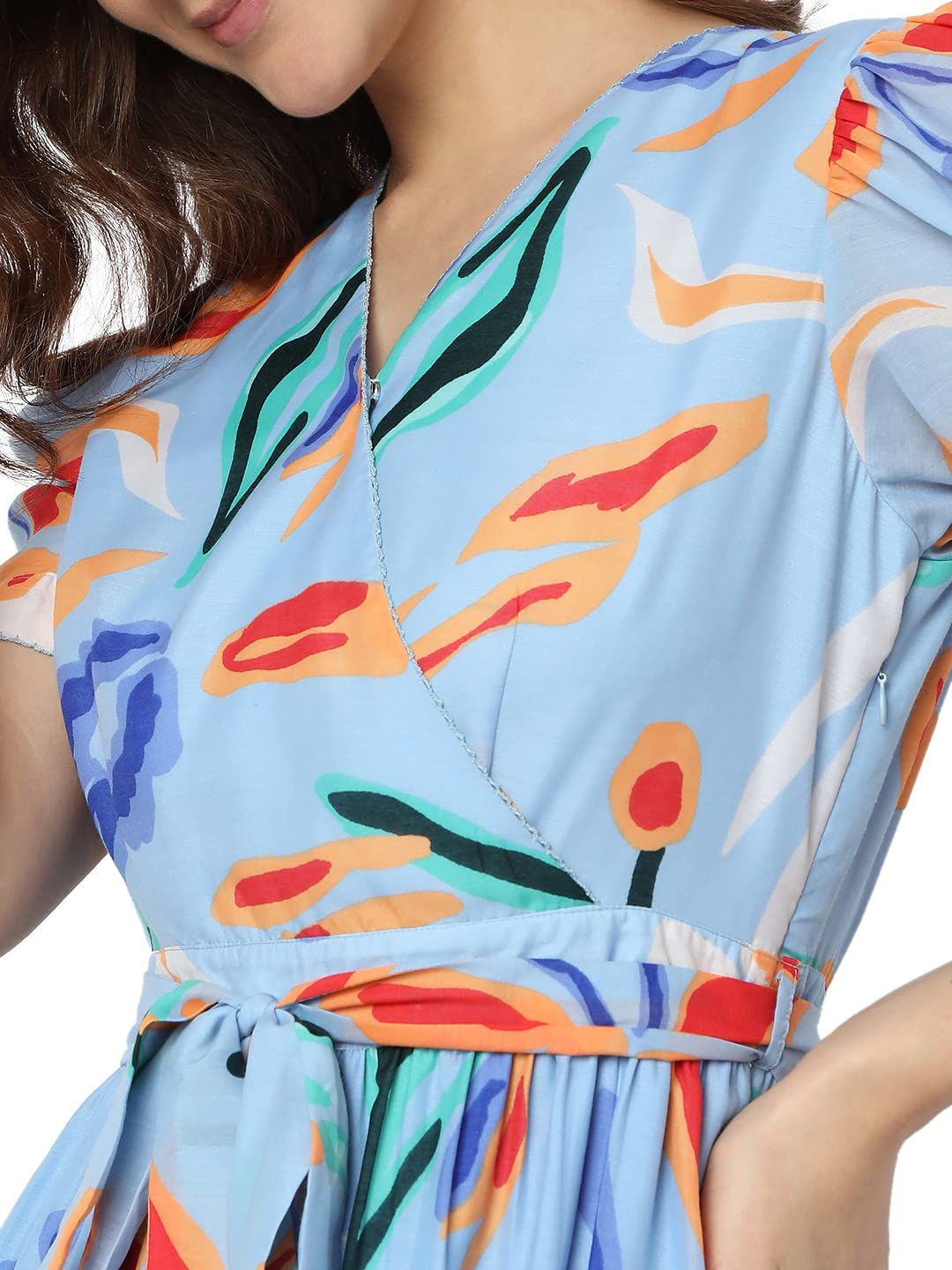Details: Blue abstract printed midi dress with short puff sleeves, mock wrap, V-neckline, and fit & flare silhouette. Calf length dress