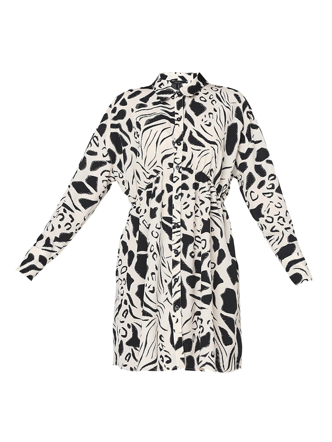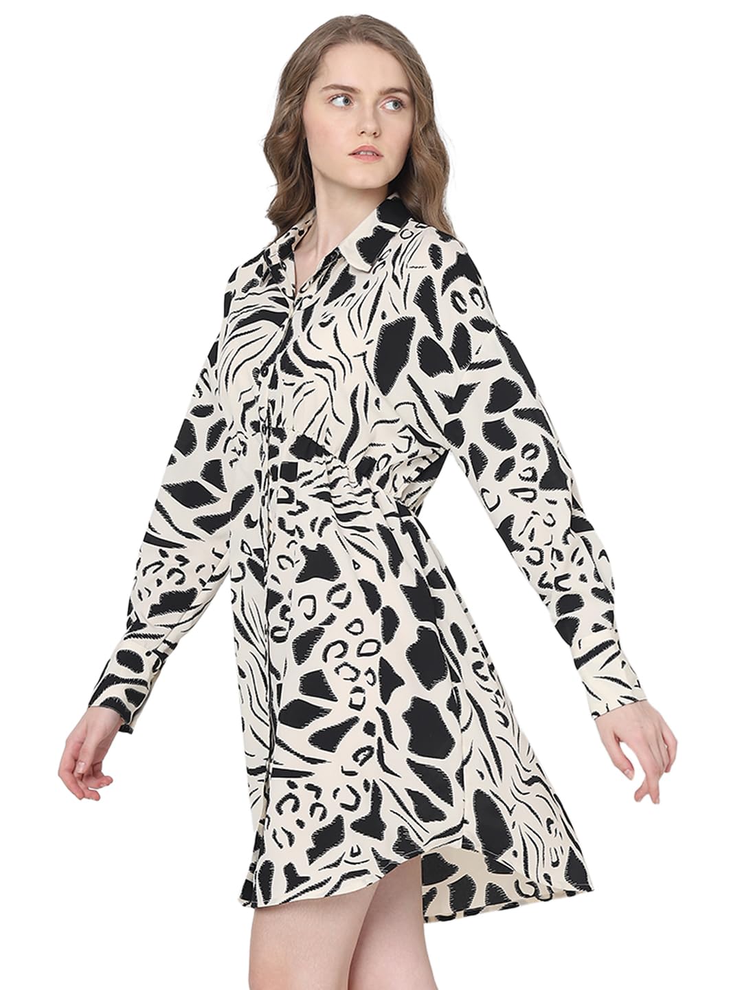Elevate your wardrobe with our Black and Beige Abstract Print Fit and Flare Mini Dress. Crafted with exquisite attention to detail, this dress boasts a sophisticated regular shirt collar and dropped shoulders for a modern twist. The voluminous long sleeves with cuffs add an elegant flair, while the curved waistline with gathers accentuates your silhouette beautifully. With a full front button placket and a slightly curved hem falling above the knees, this dress exudes timeless charm. Perfect for any occasion, embrace effortless style with our refined yet versatile creation.