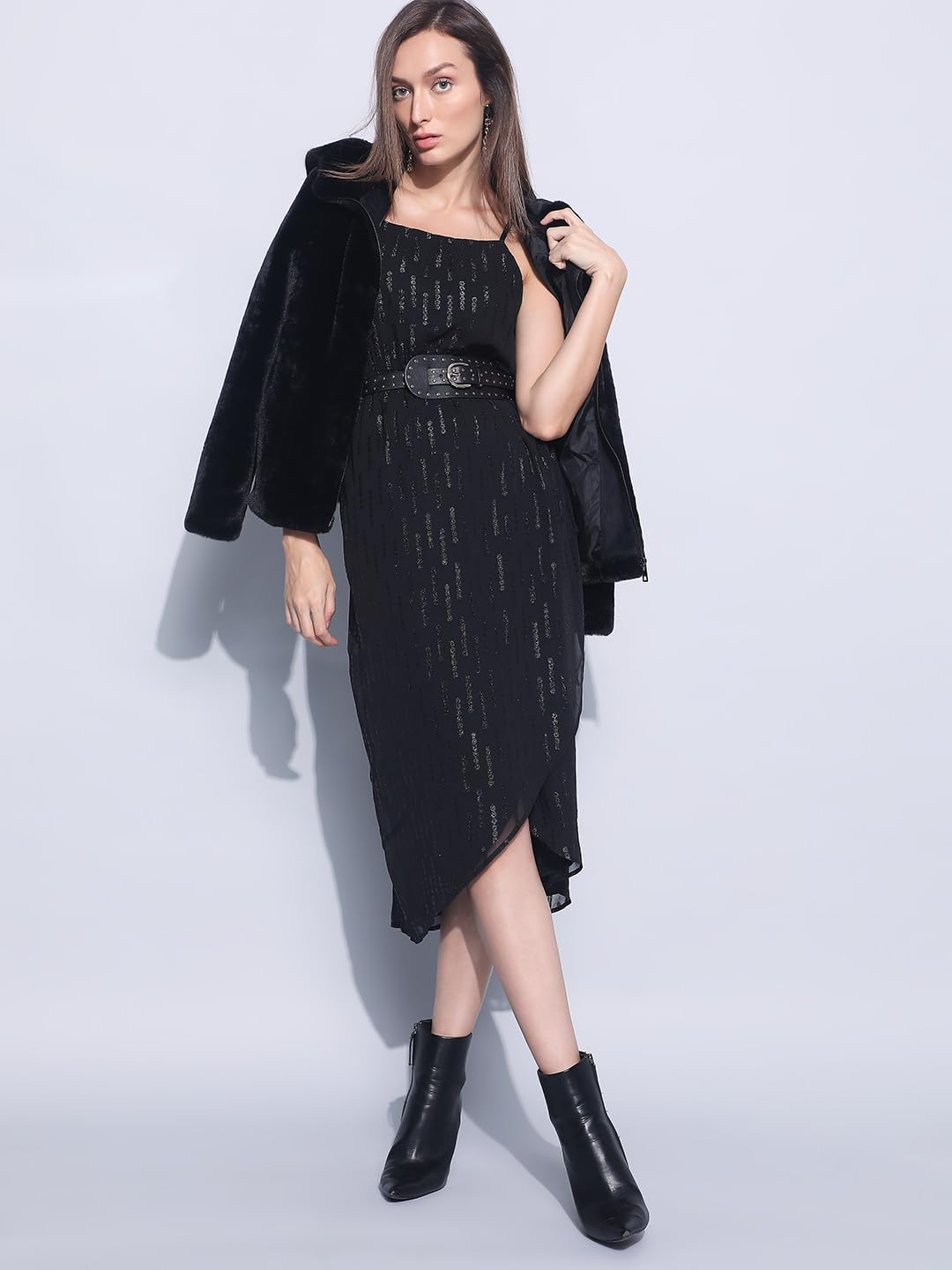 Women's black midi dress designed with sequin embellished detailing, adjustable straps, gathered at waist, tulip detail at hem, smocking at back, and midi length that falls below knee.