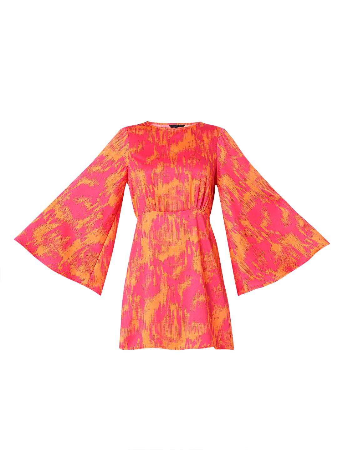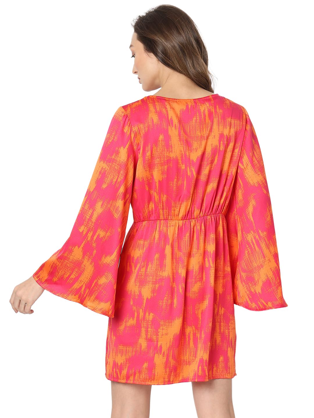 Introducing our vibrant Mini Dress – a playful symphony of orange and pink abstract prints. The round neck and long flared sleeves add a touch of elegance, while the fit-and-flare silhouette ensures a flattering look. Perfect for those who appreciate a blend of sophistication and fun. Style Note: Embrace the art of chic with this dress. Pair it with your favourite heels for a look that effortlessly transitions from day to night, making a statement wherever you go.