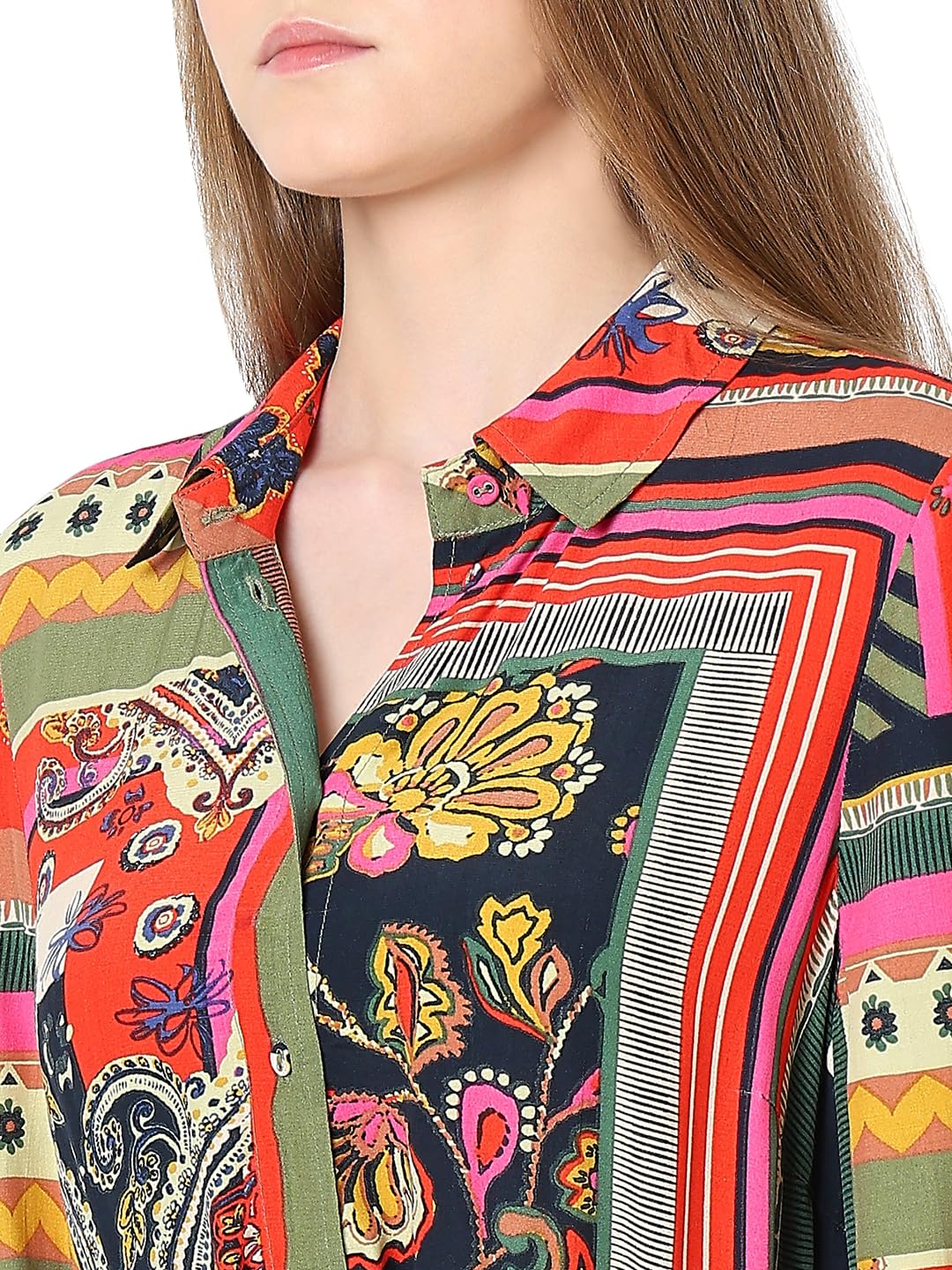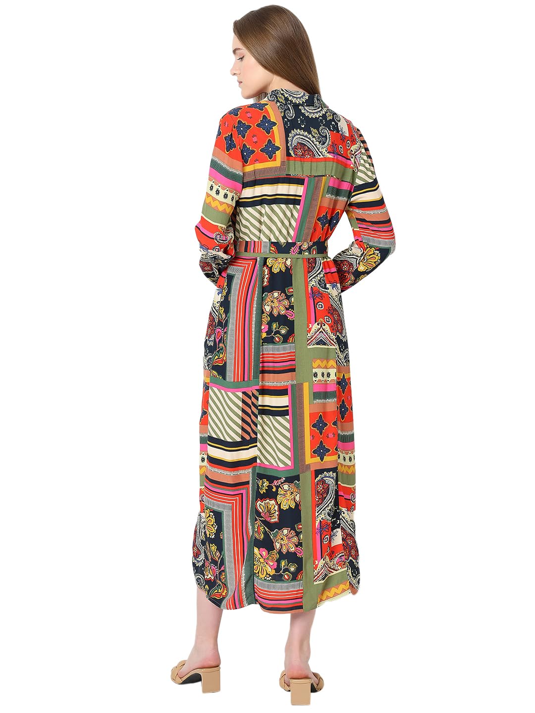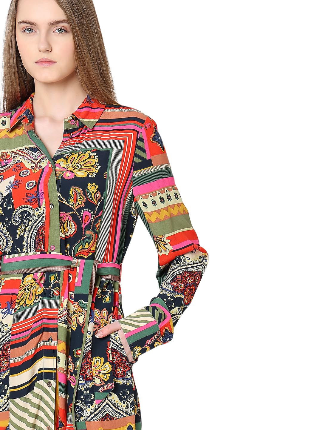 Introducing our latest addition to your wardrobe: a sophisticated masterpiece of style and comfort. This dress boasts a captivating multi-colour geometric print, elevating the essence of modern elegance. Its full sleeves and collar neckline exude refinement, while the front button-up design with a waist belt accentuates your silhouette with grace. Practicality meets chic with convenient side pockets, offering both flair and functionality. Falling below the knees in a regular fit, this dress embodies timeless sophistication for the contemporary woman.