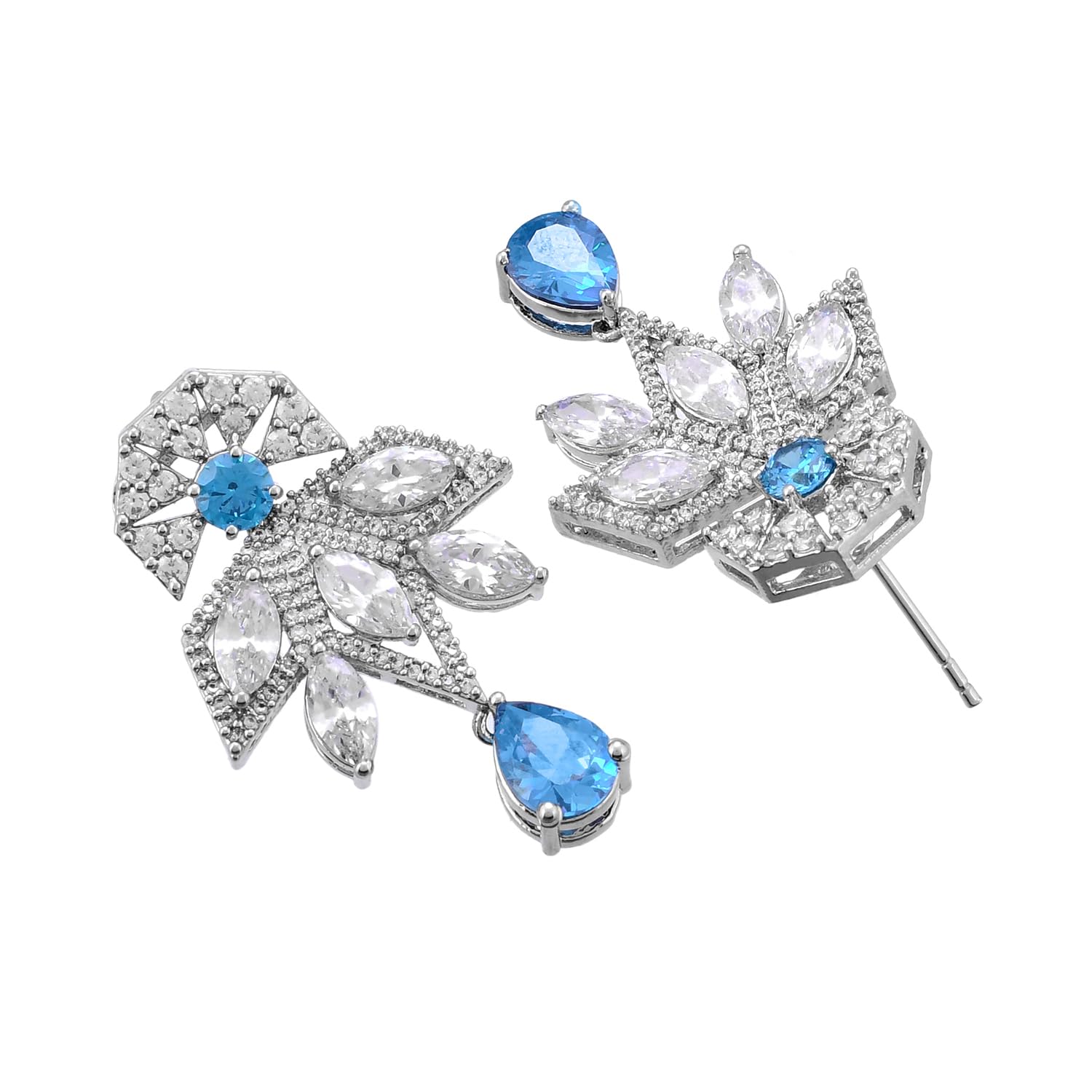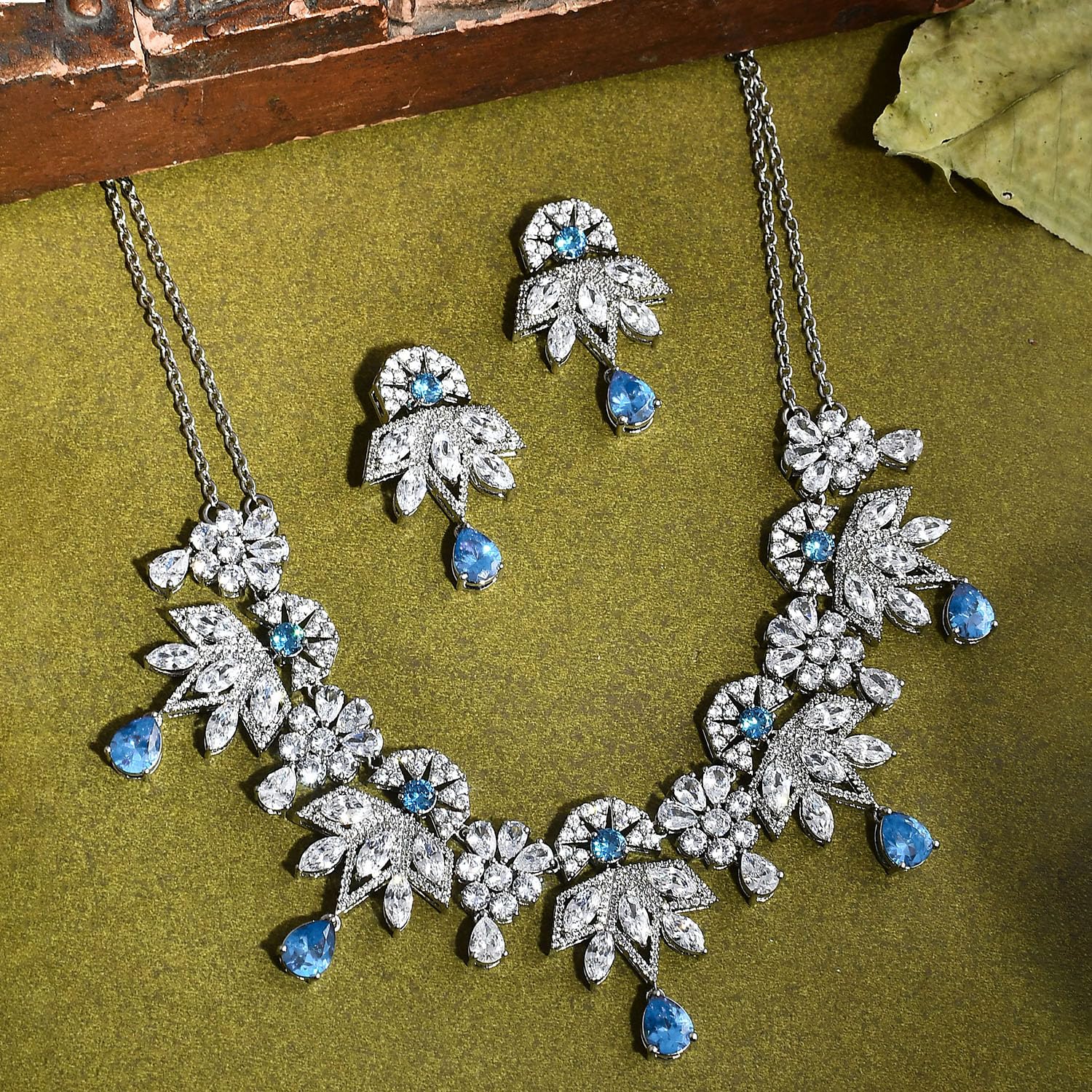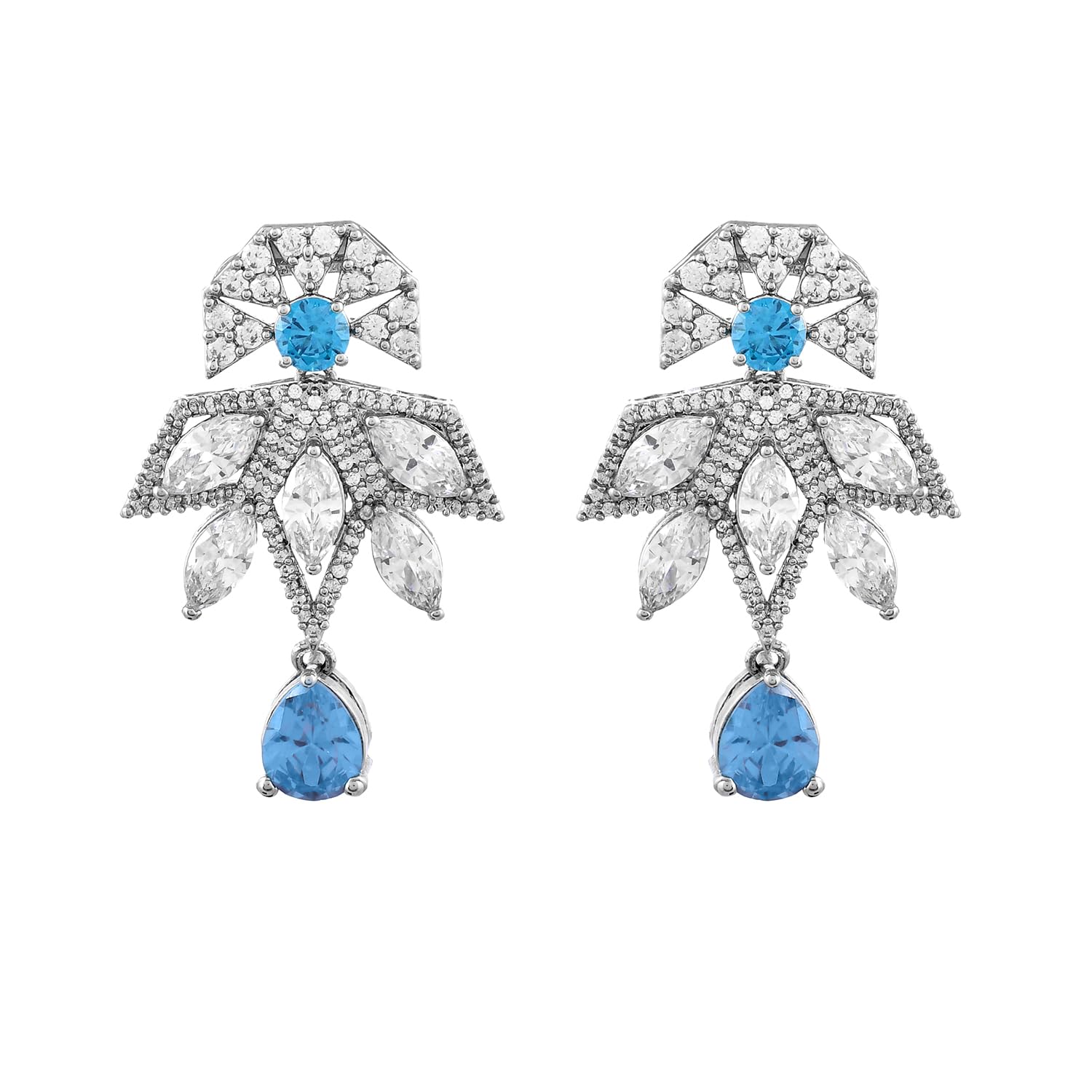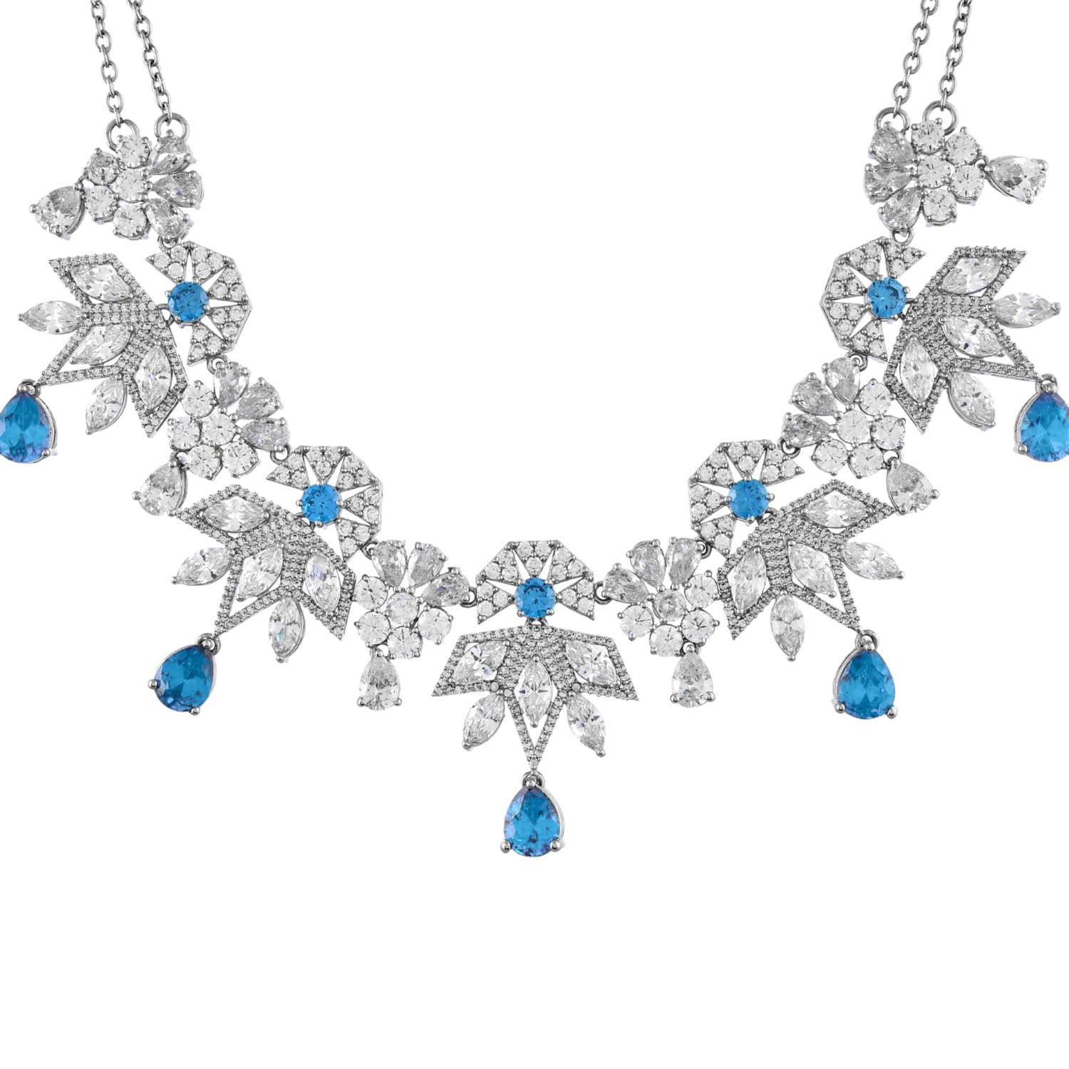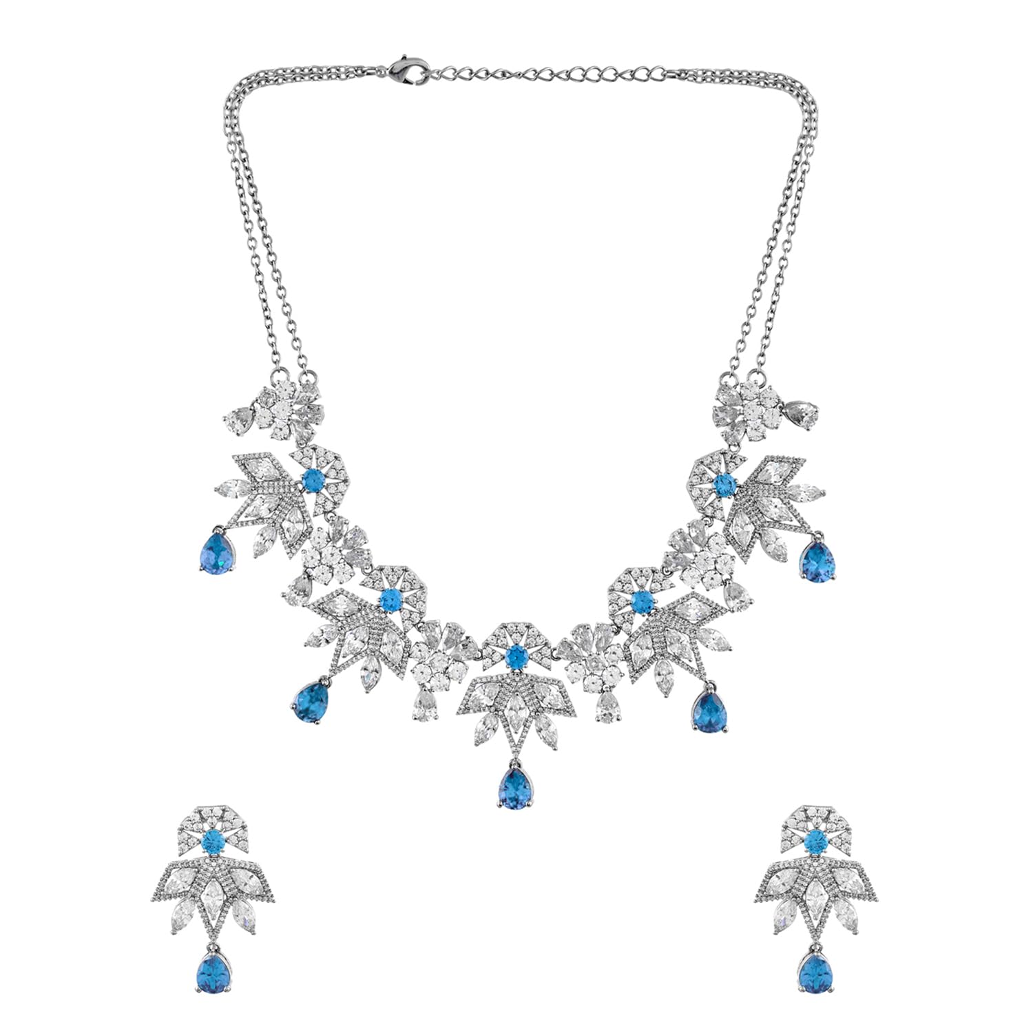 Inspired by the morning dew and the beauty of dawn, this lovely jewellery set has been fashioned out of brass. Teardrop cut blue and white zirconia gems adorn the rhodium plated necklace and earrings. Pair with a formal gown.