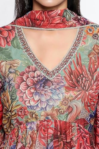 W for Woman Multicolour Printed Silver Chiffon Flared Kurta, Sharara and Dupatta Set (Size: L)-WS13199-126196
