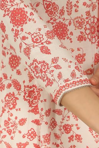 W for Woman White and Orange Floral Printed Pure Cotton Flared Kurta, Pants and Dupatta Set (Size: S)-WS12726-125580