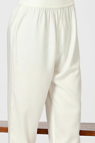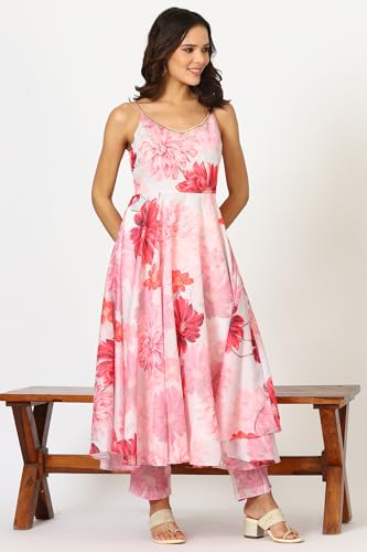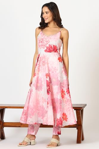 W for Woman White Digital Floral Printed Sleeveless Flared Kurta, Pants and Dupatta Set (Size: L)-24AUWS12583-123704