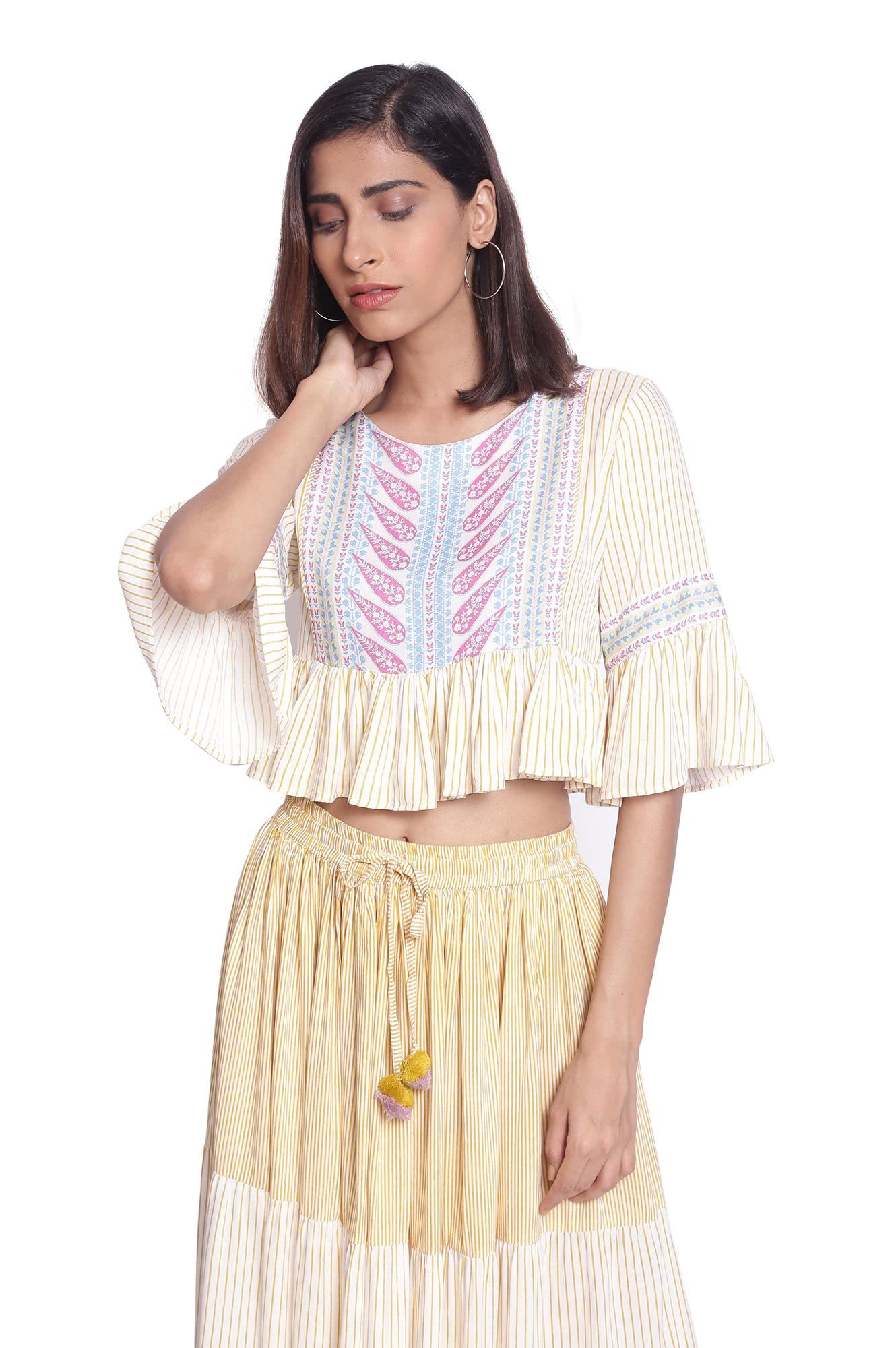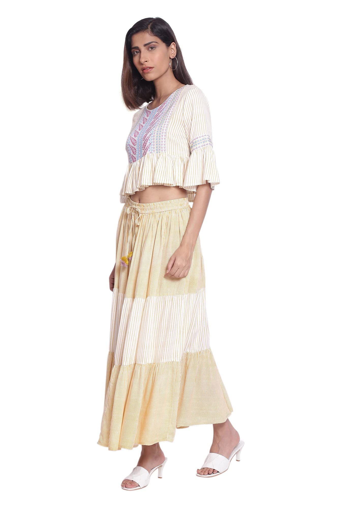 Details: Bright yellow boho stripe print top in round neck having gathered sleeves, paired with yellow stripe print flared skirt in mid-rise and elasticated waistband.