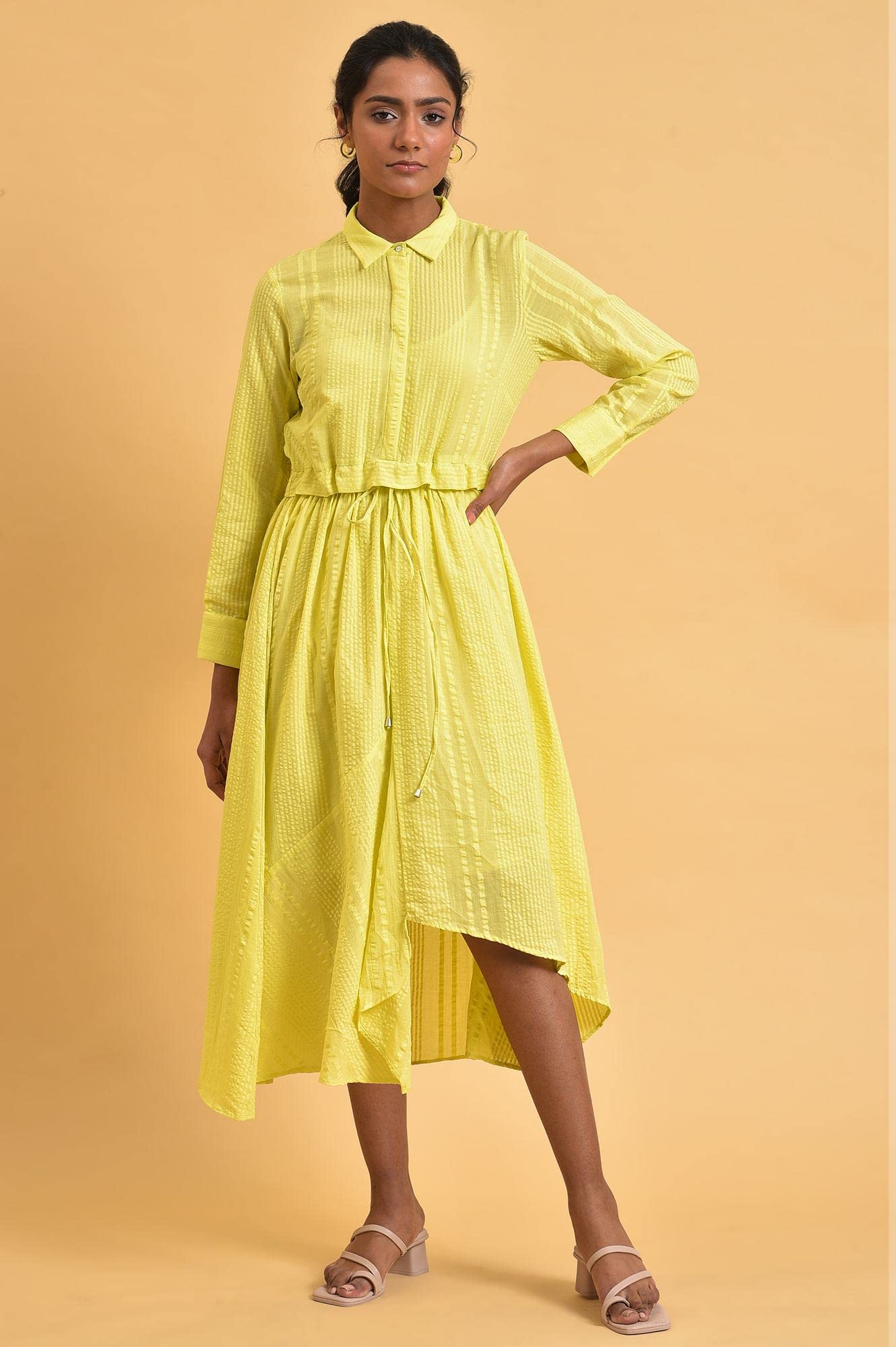 Crafted in seer sucker fabric this beautiful summer dress is a right pick for your casual or airport look. The dress has gathered silhouette and shirt collar. This pretty women's top-wear has side dipped hemline.