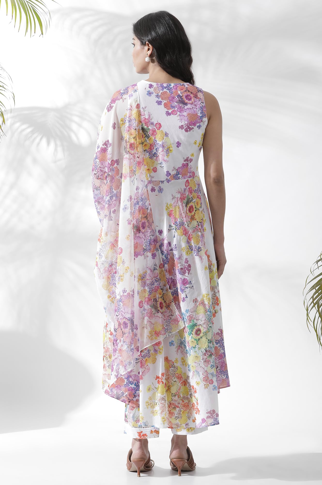 Sleeveless Circular Kurta Designed In Soft Cotton Voile. The Beautiful Floral Print Is Complemented With Delicate Lace Insert Along The V-Neckline. It Comes With Coordinating Straight Pants With A Lace Insert And A Chiffon Drape With Floral Button Detail.