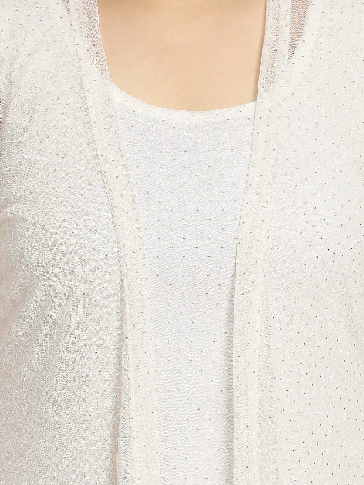 Details: Off white two piece shrug knee length dress set is made in polyester net with gold shimmer all over. Sleeveless dress with front open full sleeve shrug adds a layer of style. Stretch in fabric makes it easy to wear and gives comfort. Recommended for Dryclean. To confirm your size before purchase, refer to the Size Chart in the images
