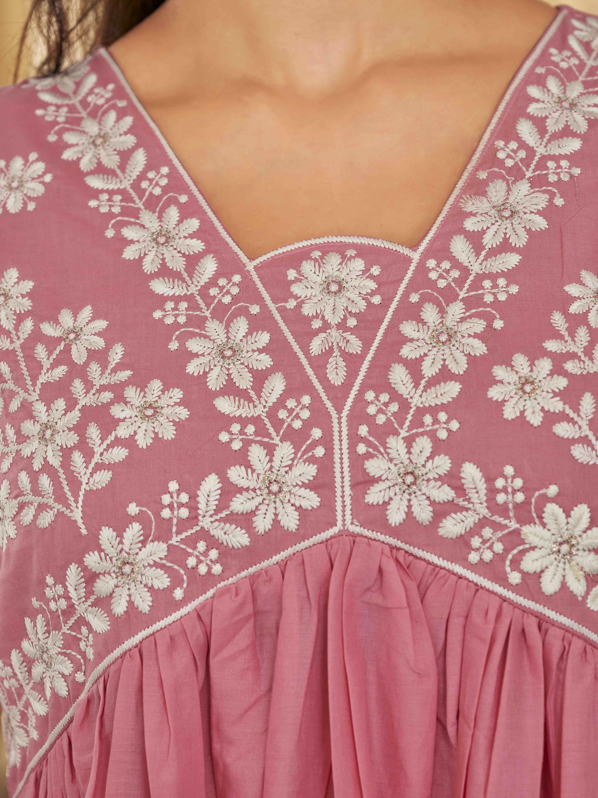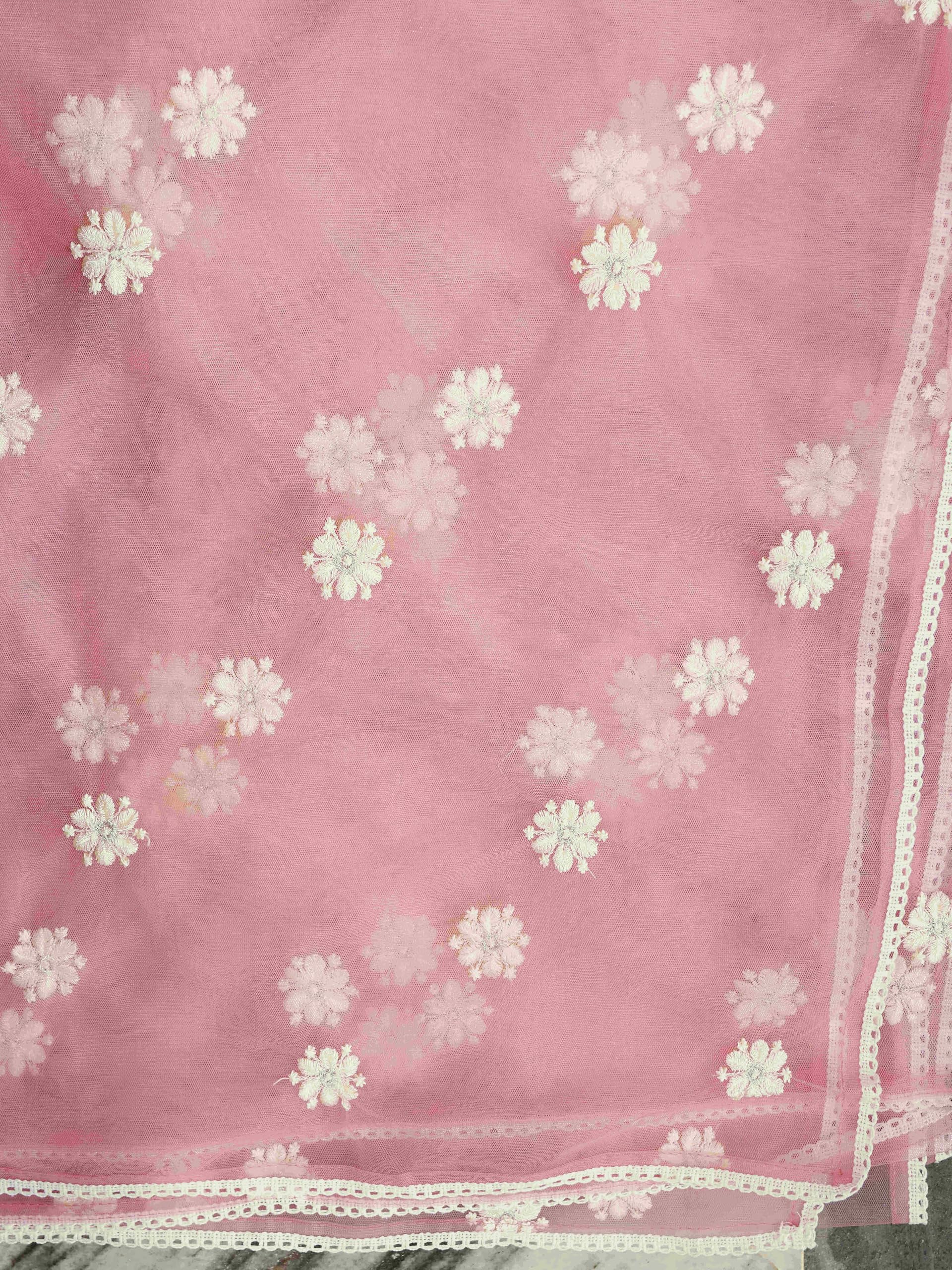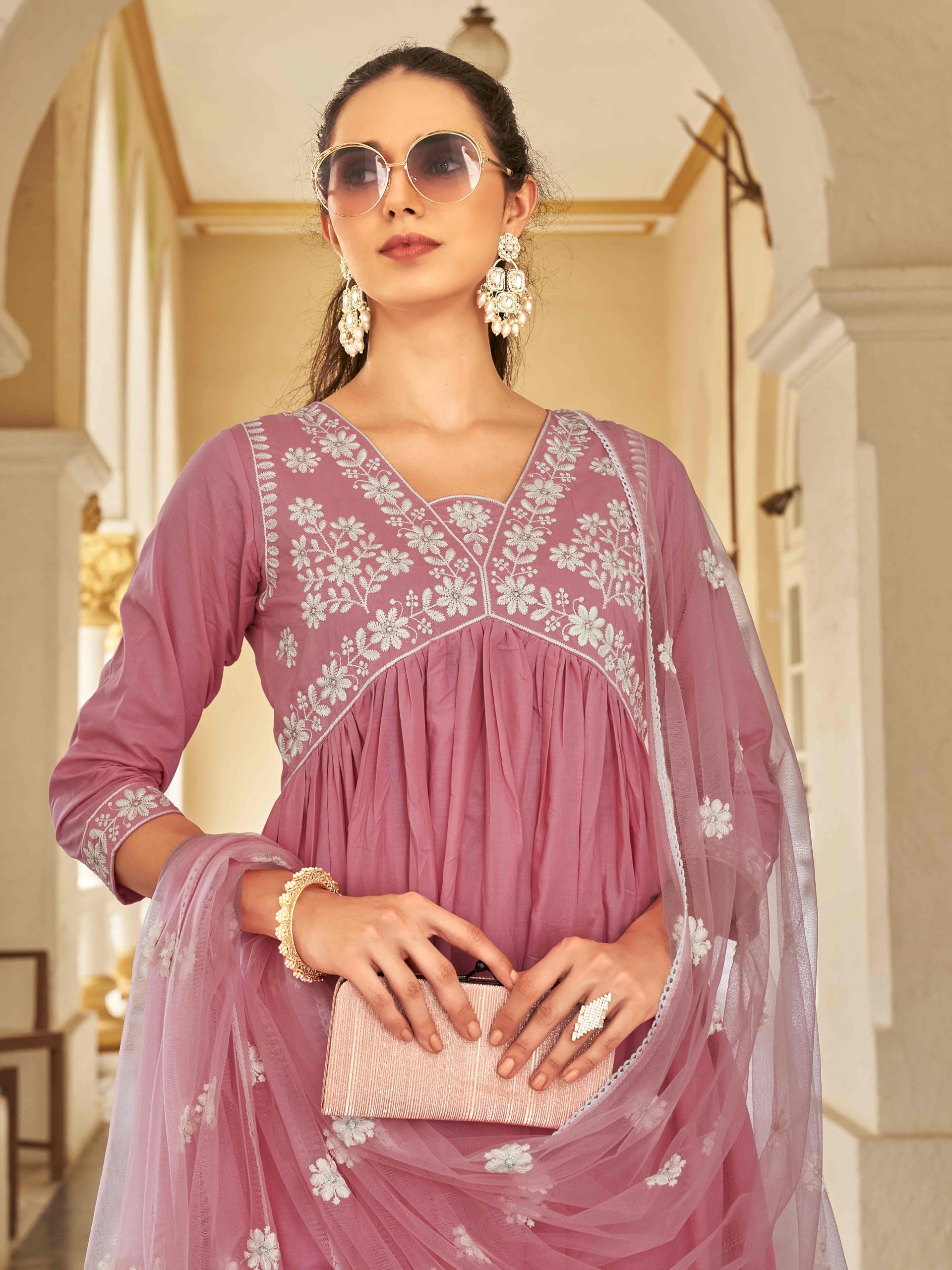 - Pink Anarkali Cotton Kurta set with chikankari embroidery and Net Dupatta