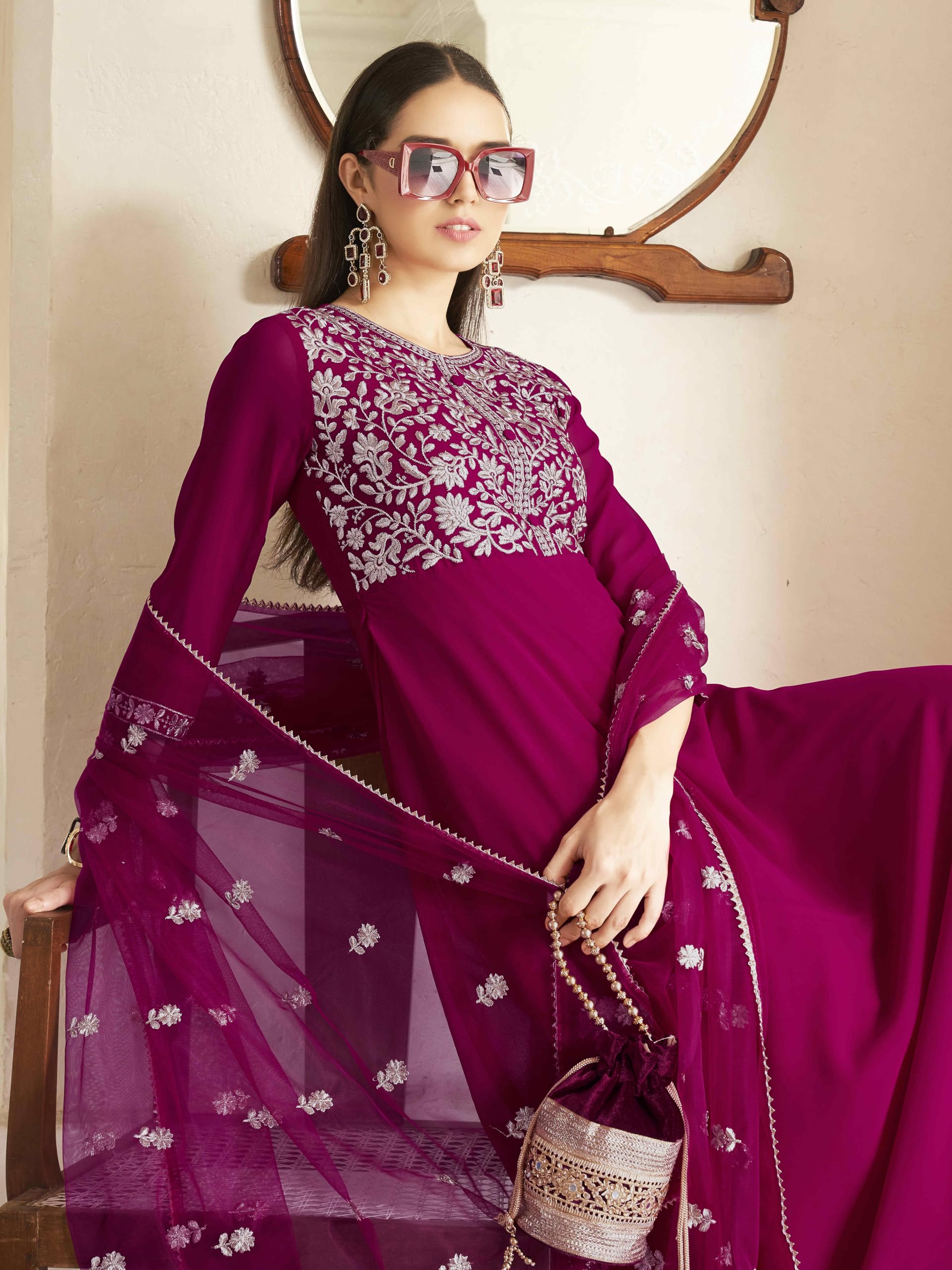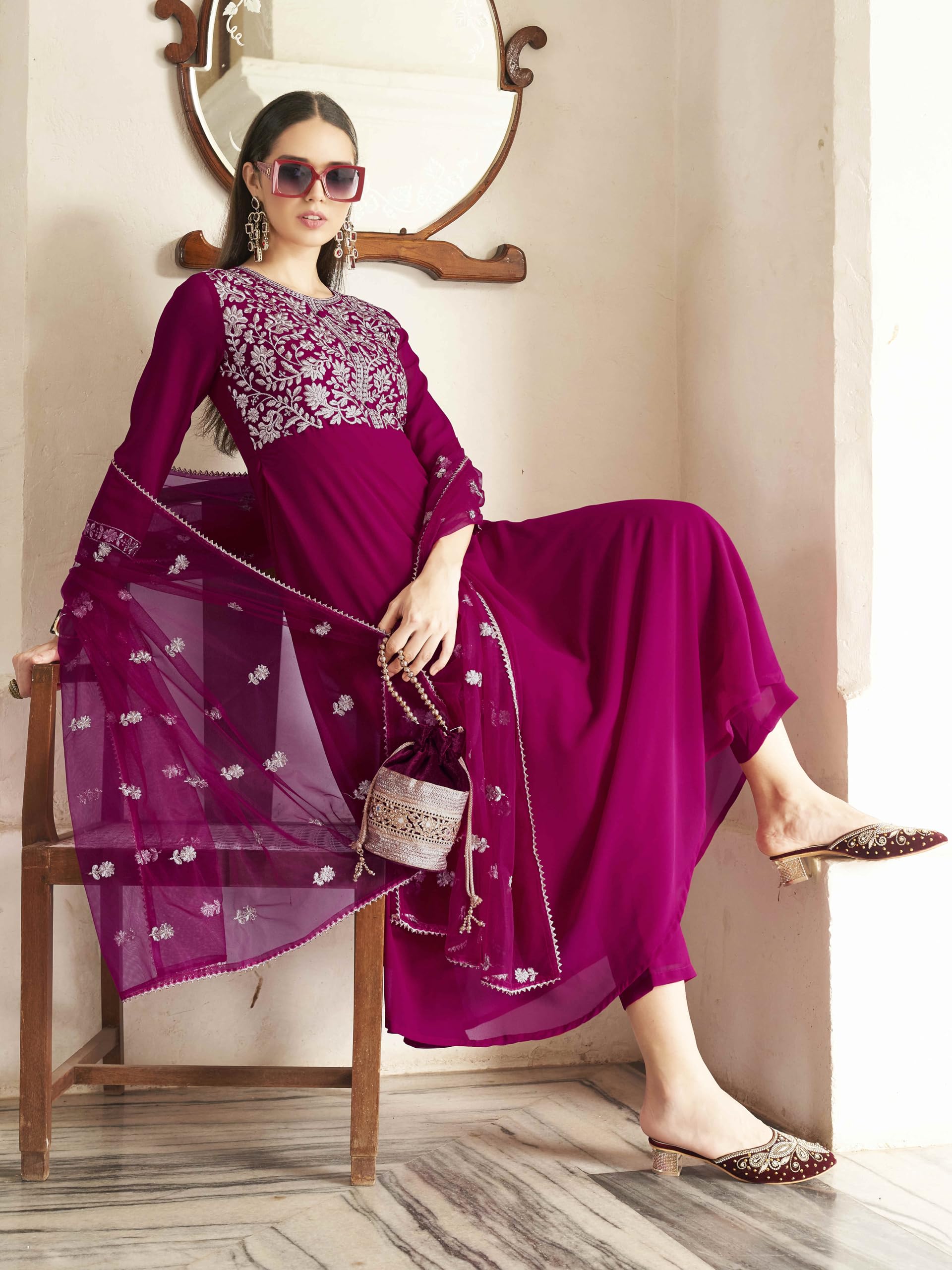 Womanista Women's Magenta Georgette Zari Embroidered Flared Kurta and Pants with Dupatta (Kurtaset_1323_XL)