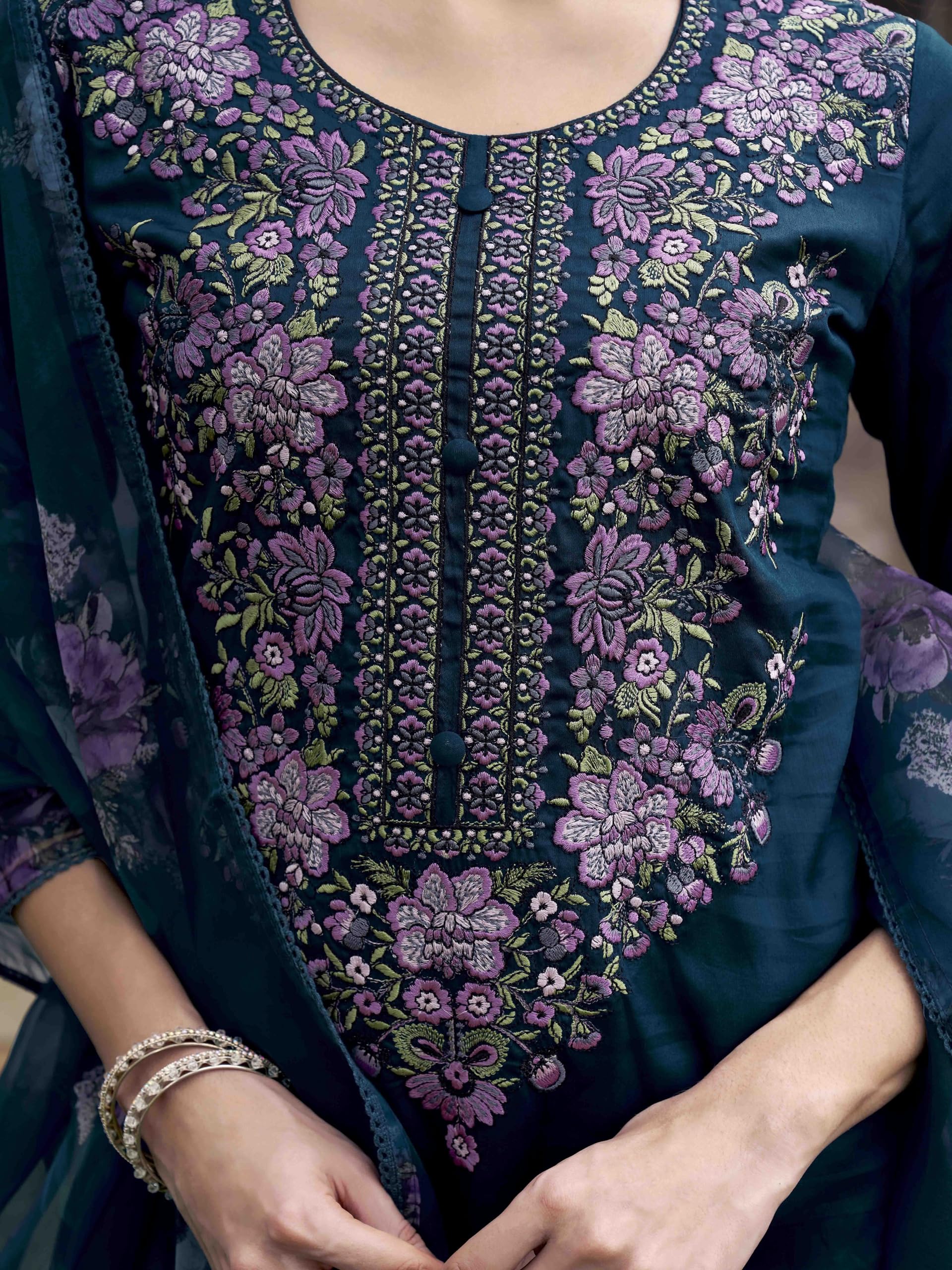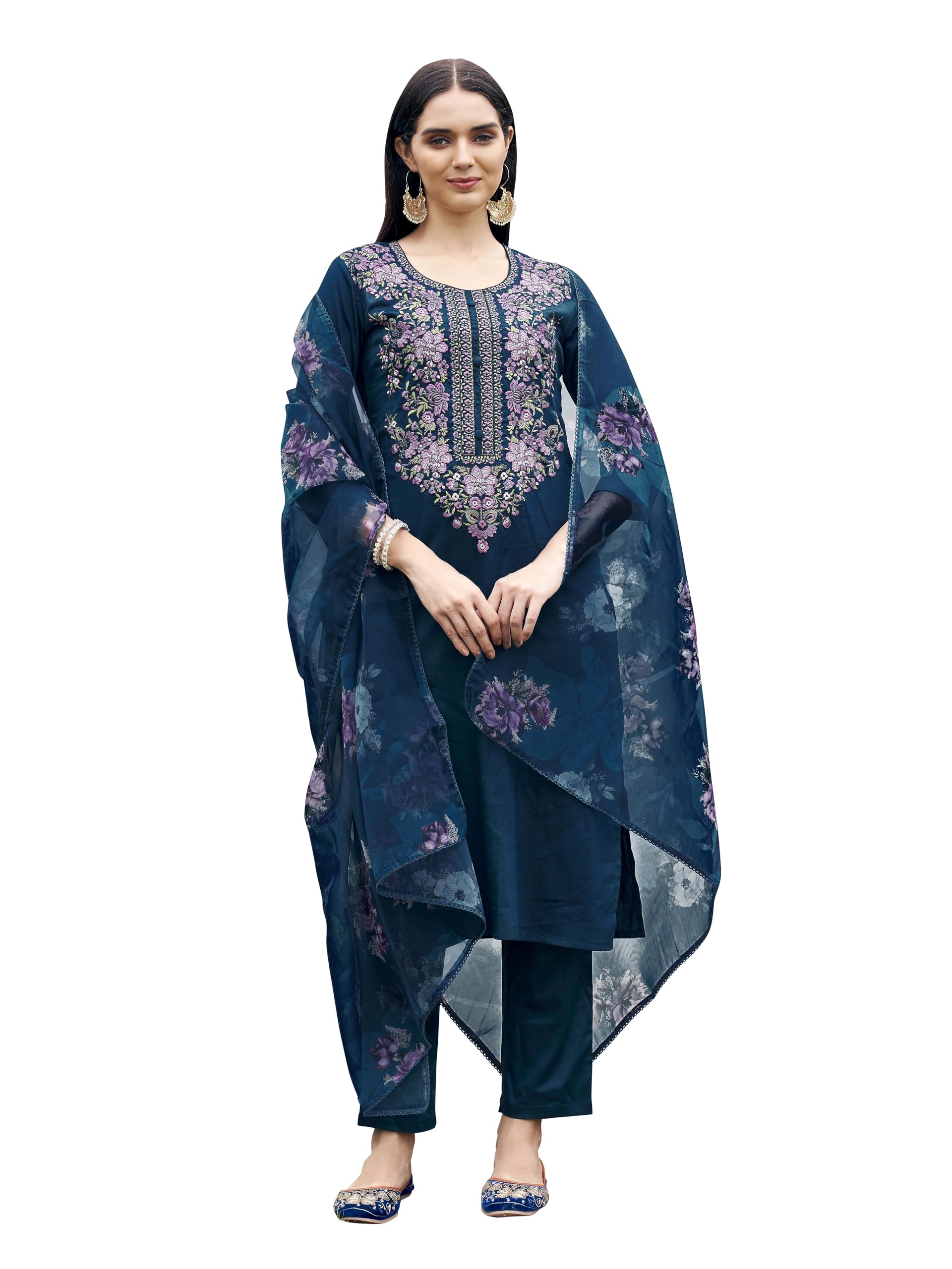 Womanista Women's Teal Blue Color Cotton Blend Multi Embroidered Kurta Set With Printed Organza Dupatta(Kurtaset_1339_L)