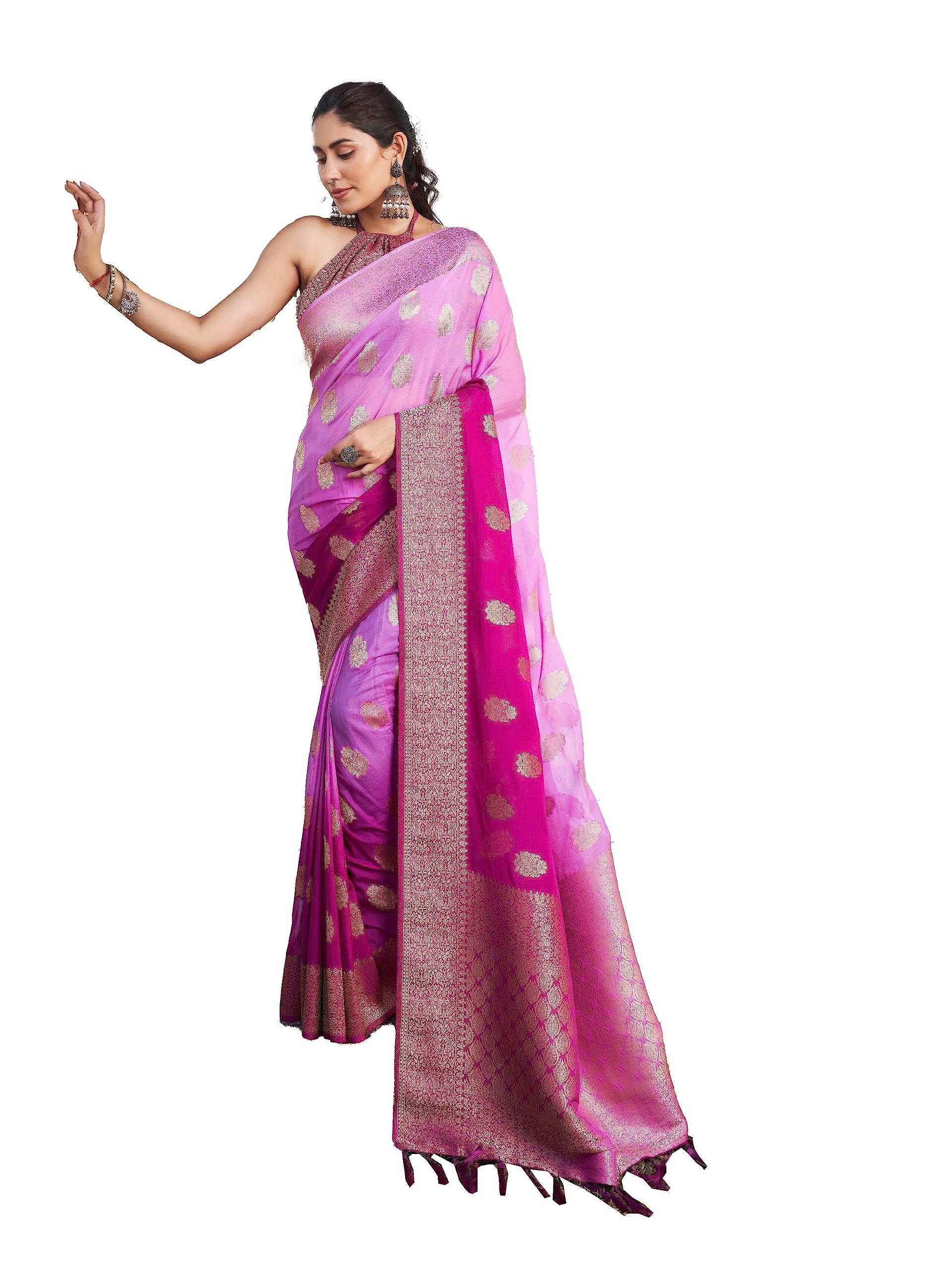 Women Banarasi Georgette Woven Work Half & Half Saree For Women With Gold Zari Border & Unstitched Blouse Piece Lilac Sari Mahika, 674
