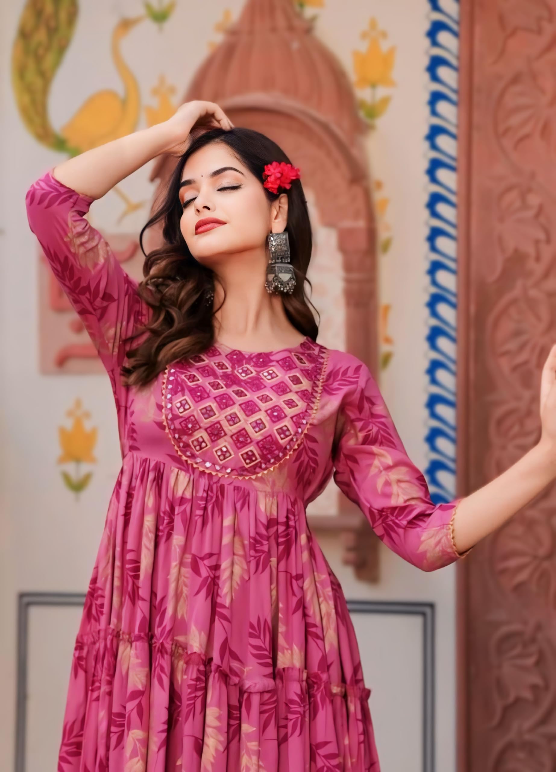 This women's rayon Anarkali kurti features a stylish floral print in vibrant pink and gold colors on a deep green base. Crafted with soft rayon fabric for all-day comfort, the kurti comes with a beautifully embroidered yoke and a flared tier