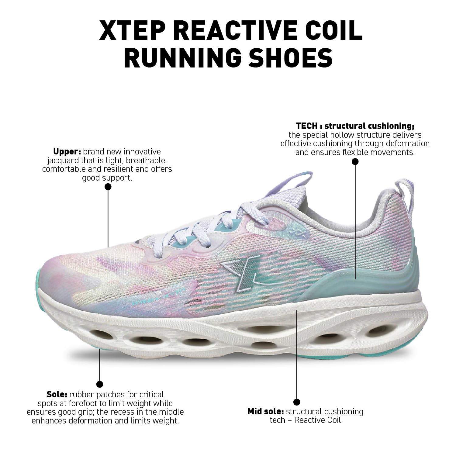 - Technology : Reactive coil Running Shoes(Rebounding Cushioning) Uses a unique hollow structuring design to provide cushioning effectively, and a flexible comfortable sports and experience.