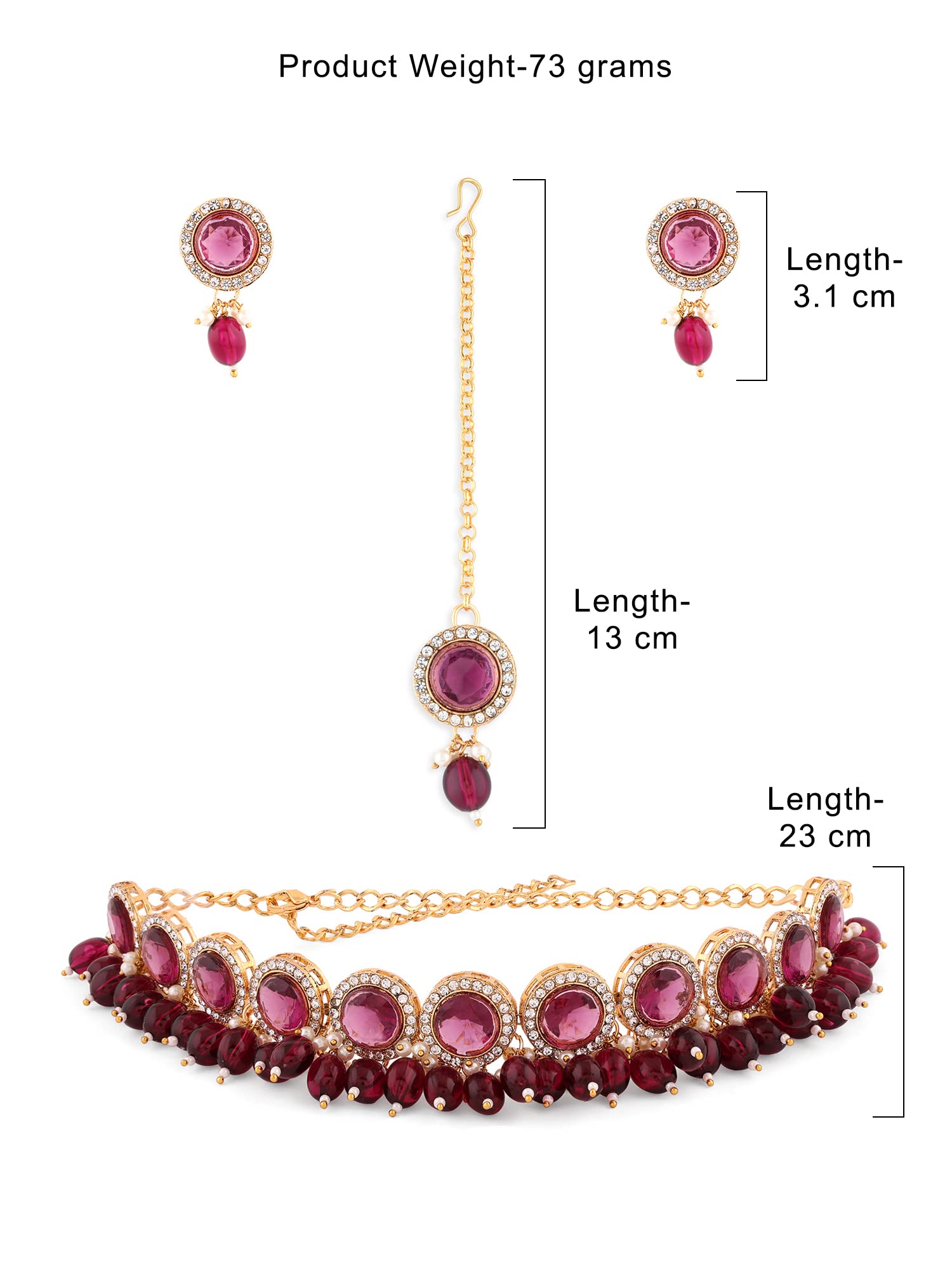 ZAVERI PEARLS Wine Color Stones & Cluster Beads Choker Necklace Earring Maangtikka & Ring Set For Women-ZPFK14598
