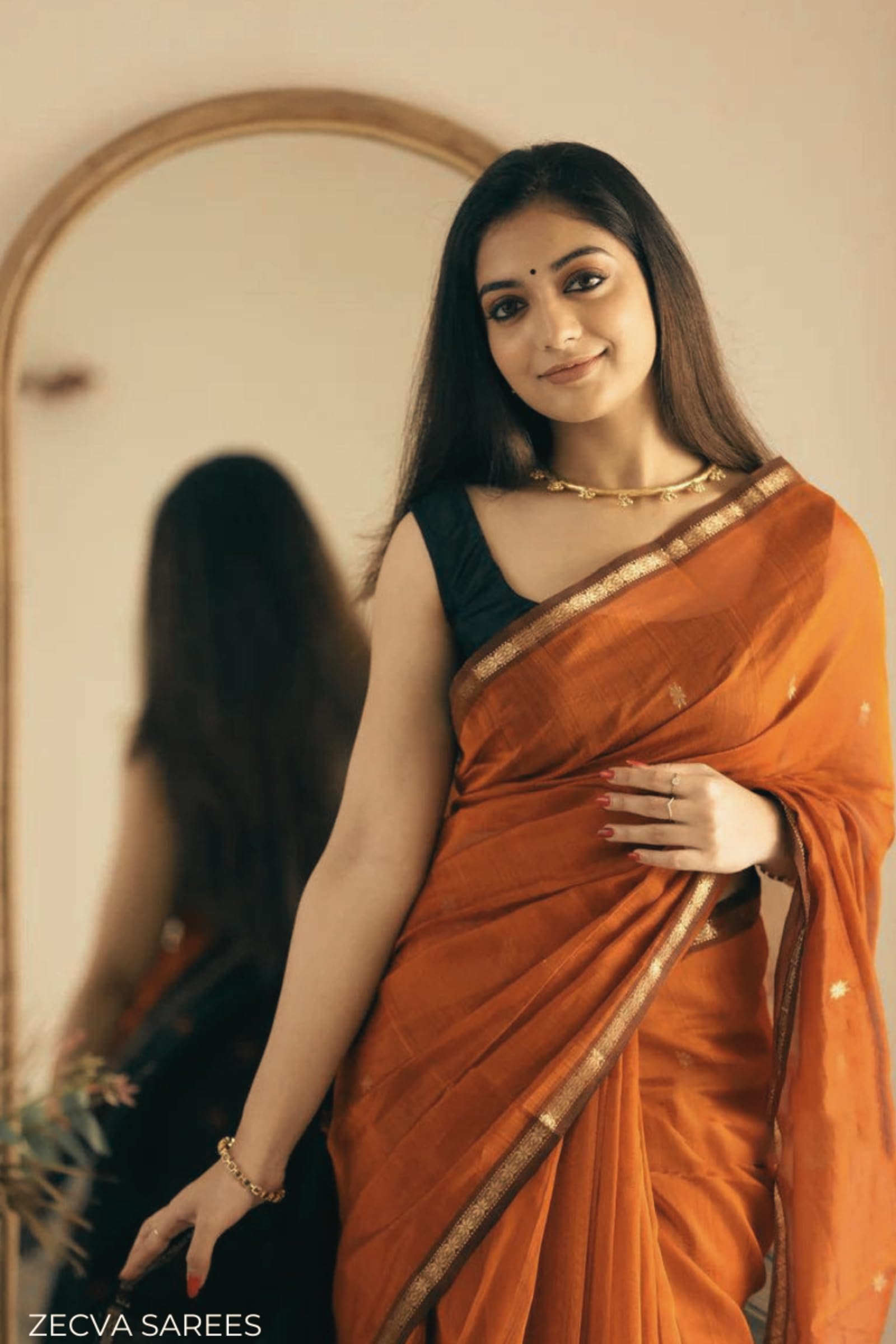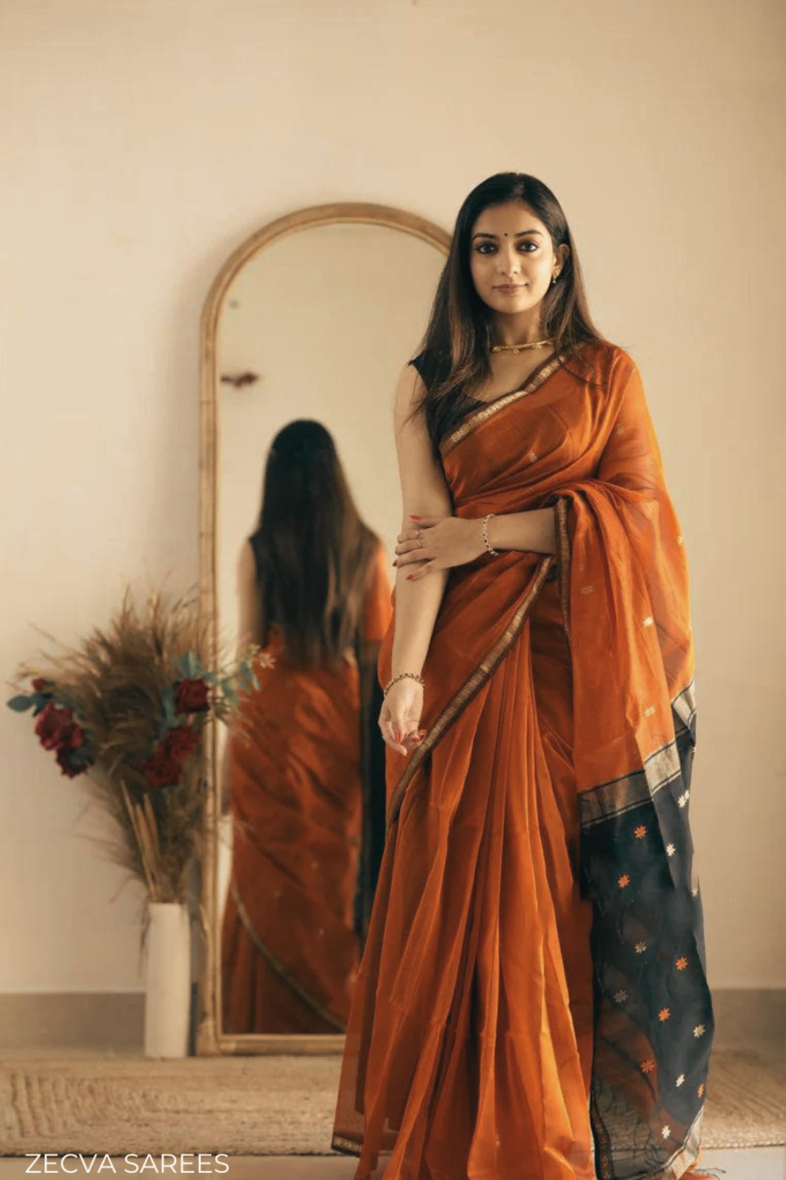 ZECVA Women's Pure Spun Linen Cotton Lichi Silk Saree With Attach Unstitch Blouse Piece (DARK ORANGE BLACK)