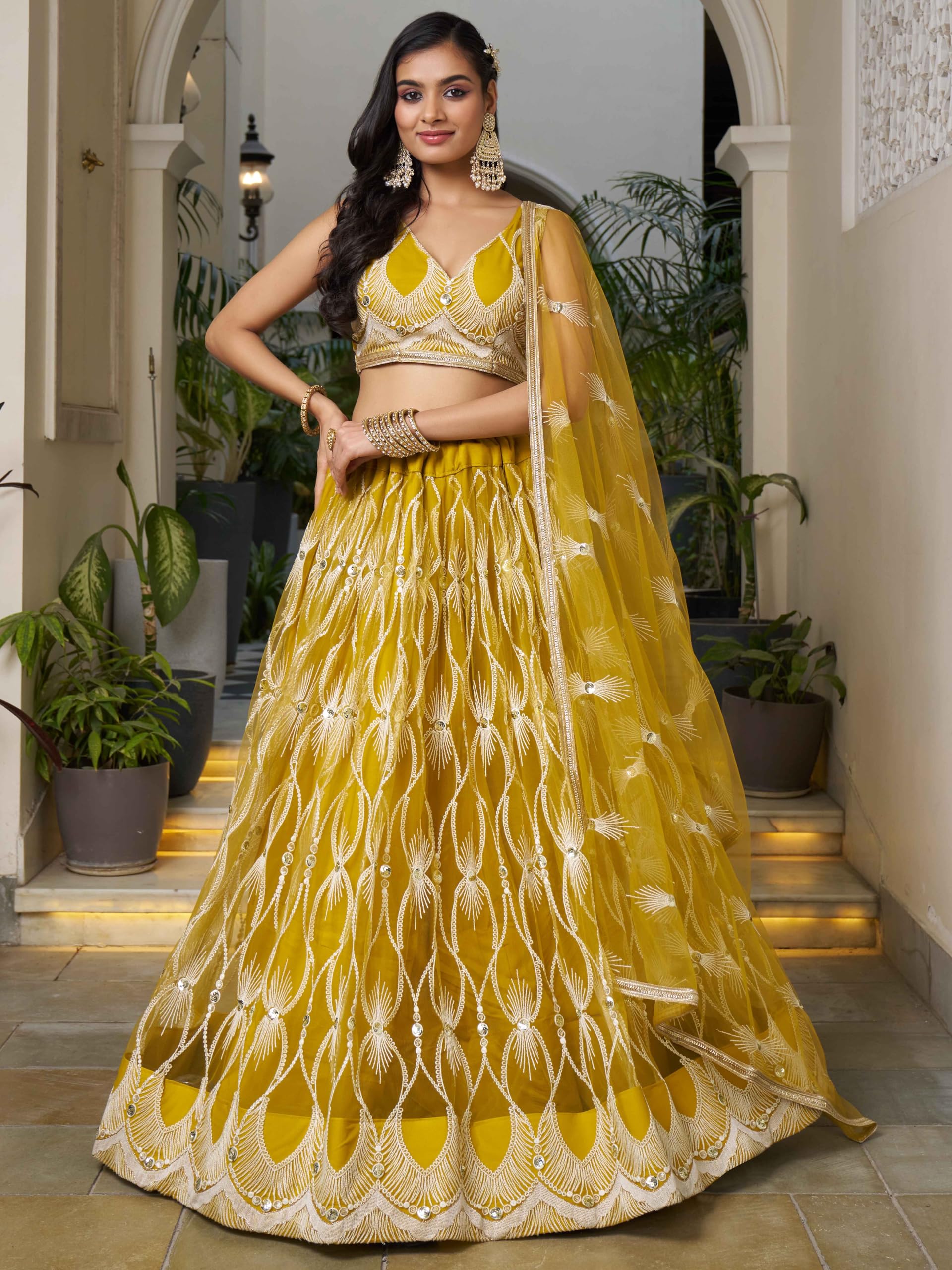 Zeel Clothing Women's Cotton Thread Sequins Work Embroidery Soft Net Semi-Stitched Lehenga Choli Set With Dupatta (Nfh-2139-Yellow-Women-Lehenga-Choli-Latest; Free Size)